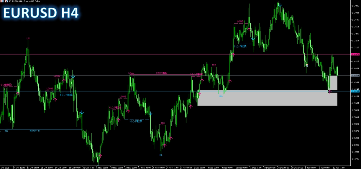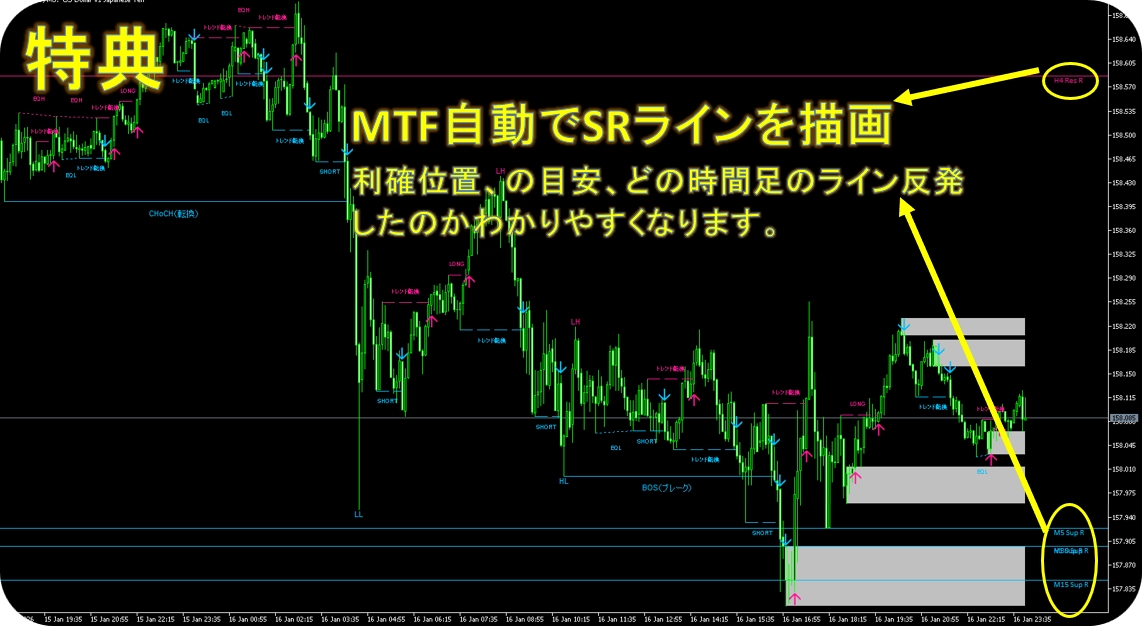チャート上の高値・安値の流れからスイングを自動検出し、直近の重要ラインを終値ベースでブレイクした瞬間をLONG/SHORT(BOS)/トレンド転換(CHoCH)として表示。さらに、ブレイクに伴ってオーダーブロック(OB)、同値高安(EQ)、フェアバリューギャップ(FVG)、Premium/Discountゾーンなどを重ねて描画し、エントリー判断に必要な「根拠」を一目で整理できます。