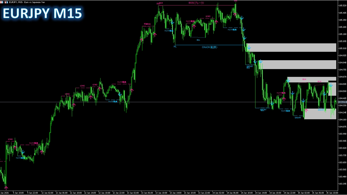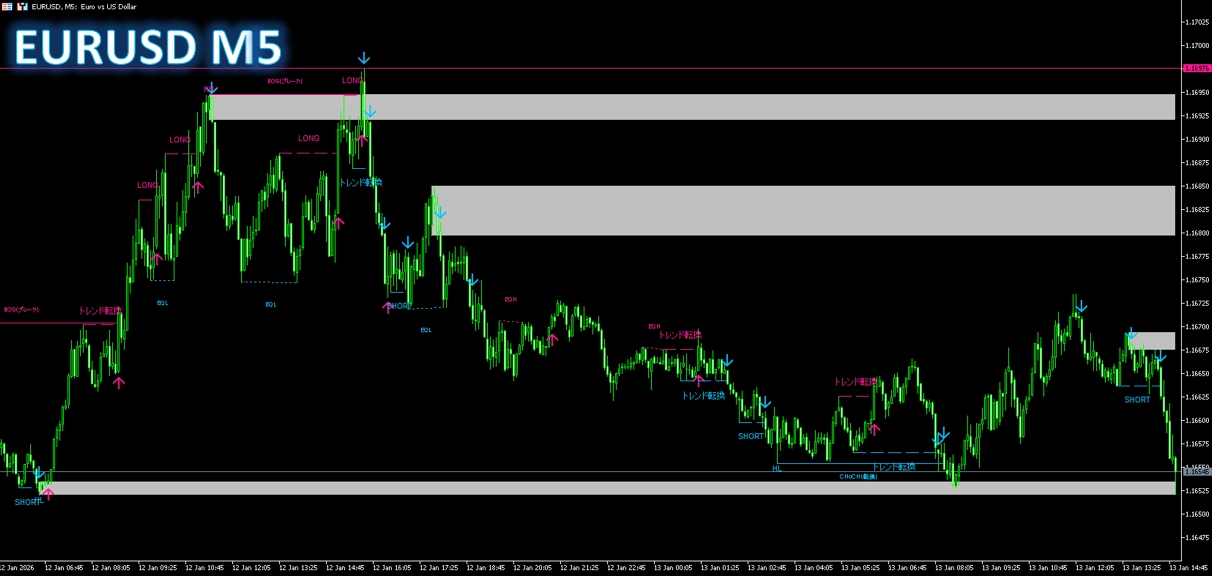 短期(M1〜M15)は内部構造・ゾーンブレイクの反応が速く、上位足(H1〜D1)は大局の環境認識に向きます。
