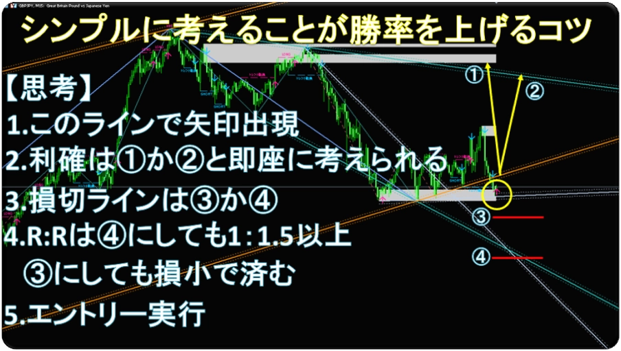 上位足の方向、直近の重要高安、ボラティリティなども合わせることで再現性が上がります。