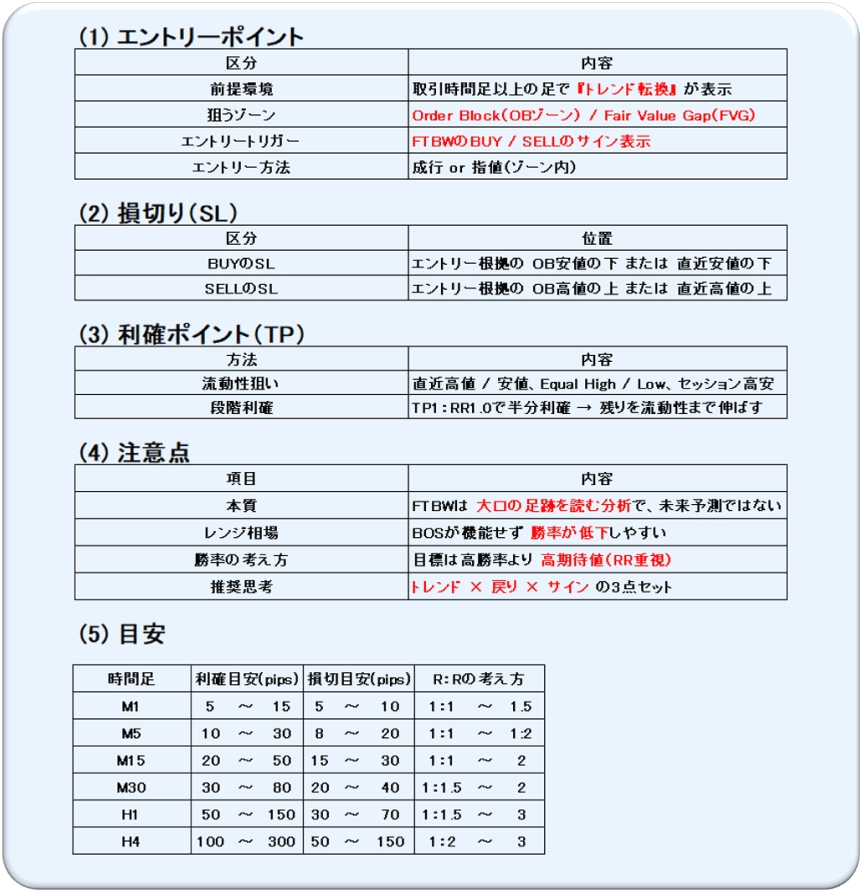 A. FTBWは8種類のロジックを組合せ、価格の構造(BOS/CHoCH)・オーダーブロック(OB/IOB)・同値高安(EQ)・FVG を可視化し、相場の転換や ブレイクの初動を判断しやすくするインジケーターです。
