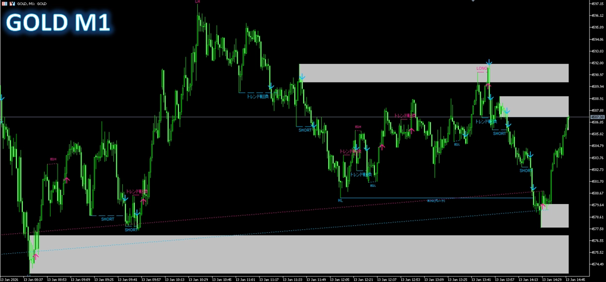 GOLD M1で、実際にインジのサインが表示される様子をご覧ください。