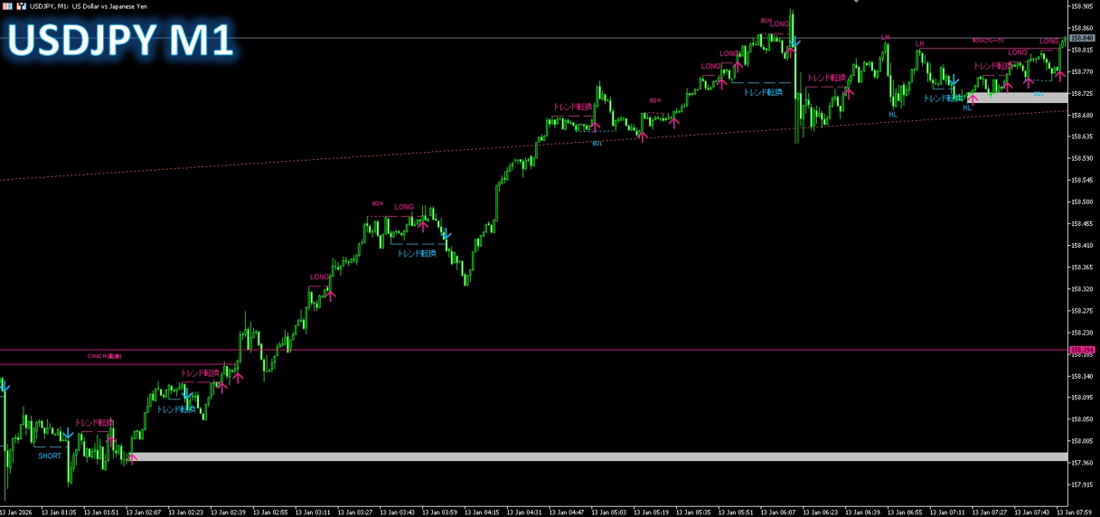 本インジケーターは、複数の高度なロジックを組み合わせ、足の確定ごとに過去データを再評価する仕組みを採用しています。