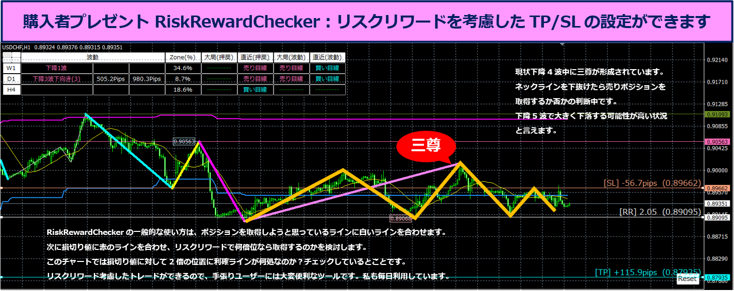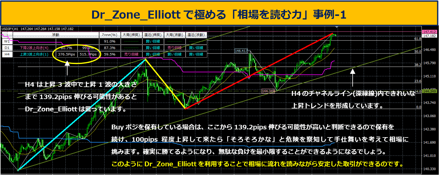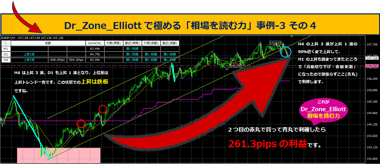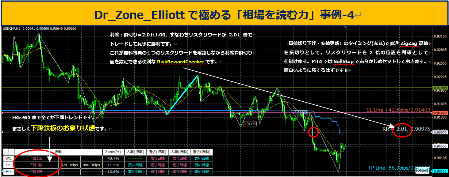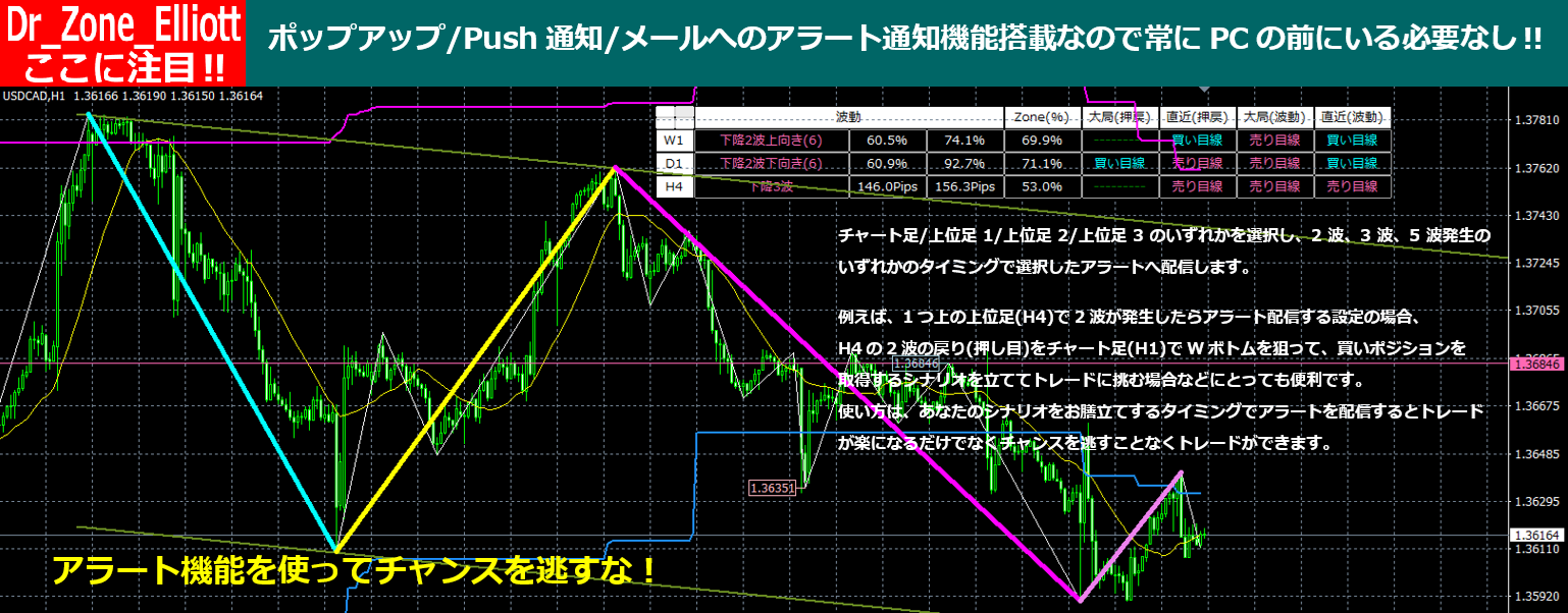 Dr_Zone_Elliottは、このように上位足の波動や状況、レジスタンスやサポートなど様々な情報をMixして現状をよく理解して正しく仕掛けることができるツールです。