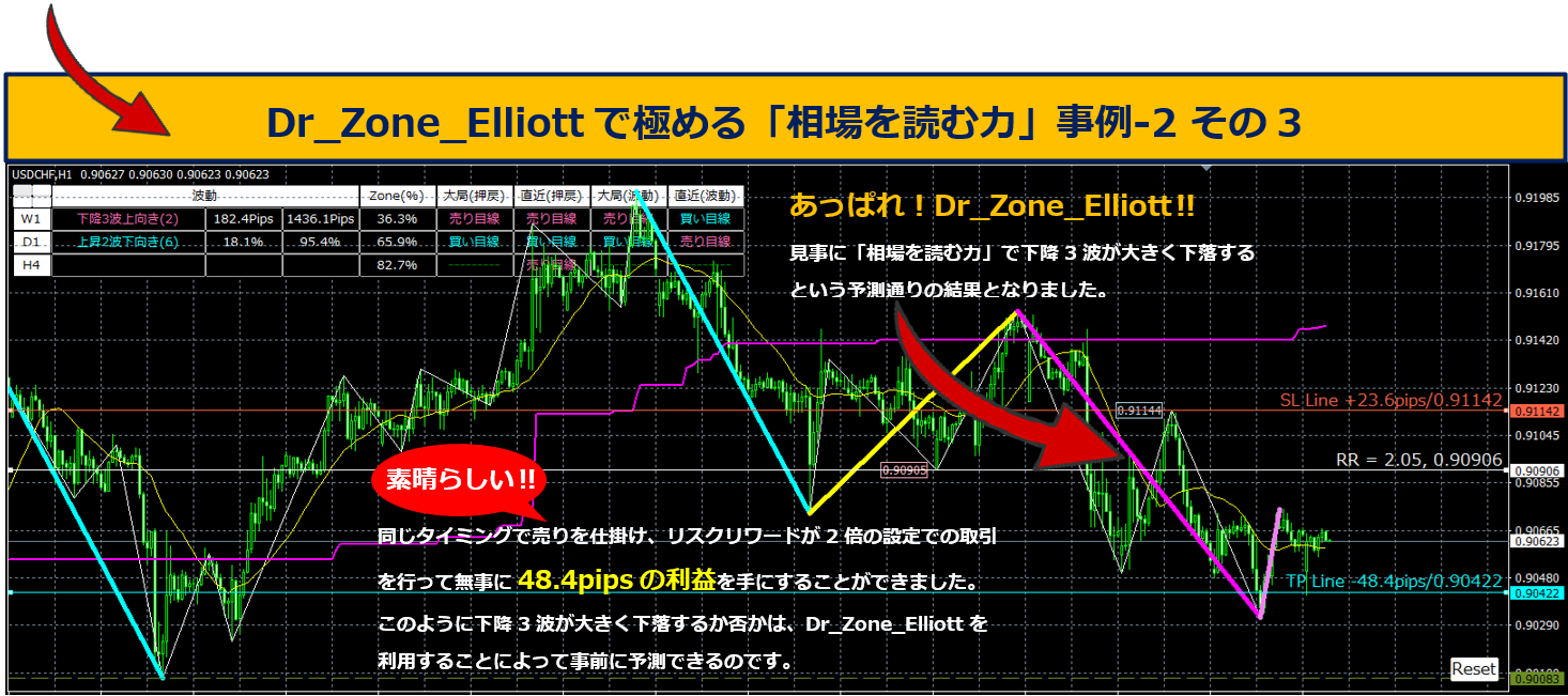 見事に「相場を読む力」で下降3波が大きく下落するという予測通りの結果となりました。リスクリワードが2倍の設定で売り注文を入れ、48.4pipsの利益を手にしました。