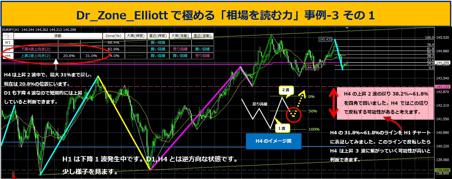 H4の上昇2波は47.3%で反転して現在11.9%まで戻っています。上図のピンク色横長四角(戻り率31.8%~61.8%)の間で止まり、上昇3波発生に向けて大きく上昇している状況です。これではH1のエリオット波動は下降2波が下降1波の始点を超えてしまう可能性が高いです。早い段階での仕掛けであれば赤丸の「安値切り上げ・高値更新」を確認して買い注文を入れるのも面白いと思います。