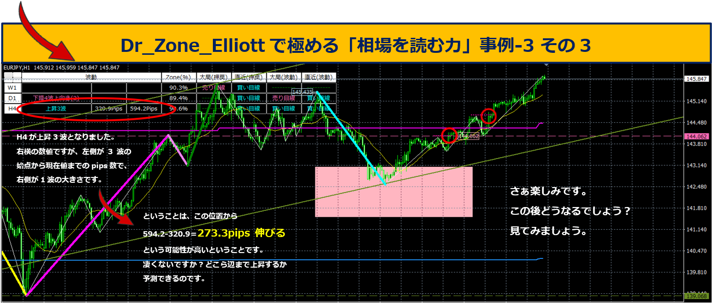 H4が上昇3となりました。上位足表示3波のときの数値は、「3波の始点からの現在までの大きさ」と「1波の大きさ」です。上図では、上昇3波の始点からの大きさが32.0pips、1波の大きさが594.2pipsです。ということは、この位置から273.3pips伸びる可能性が高いということです。