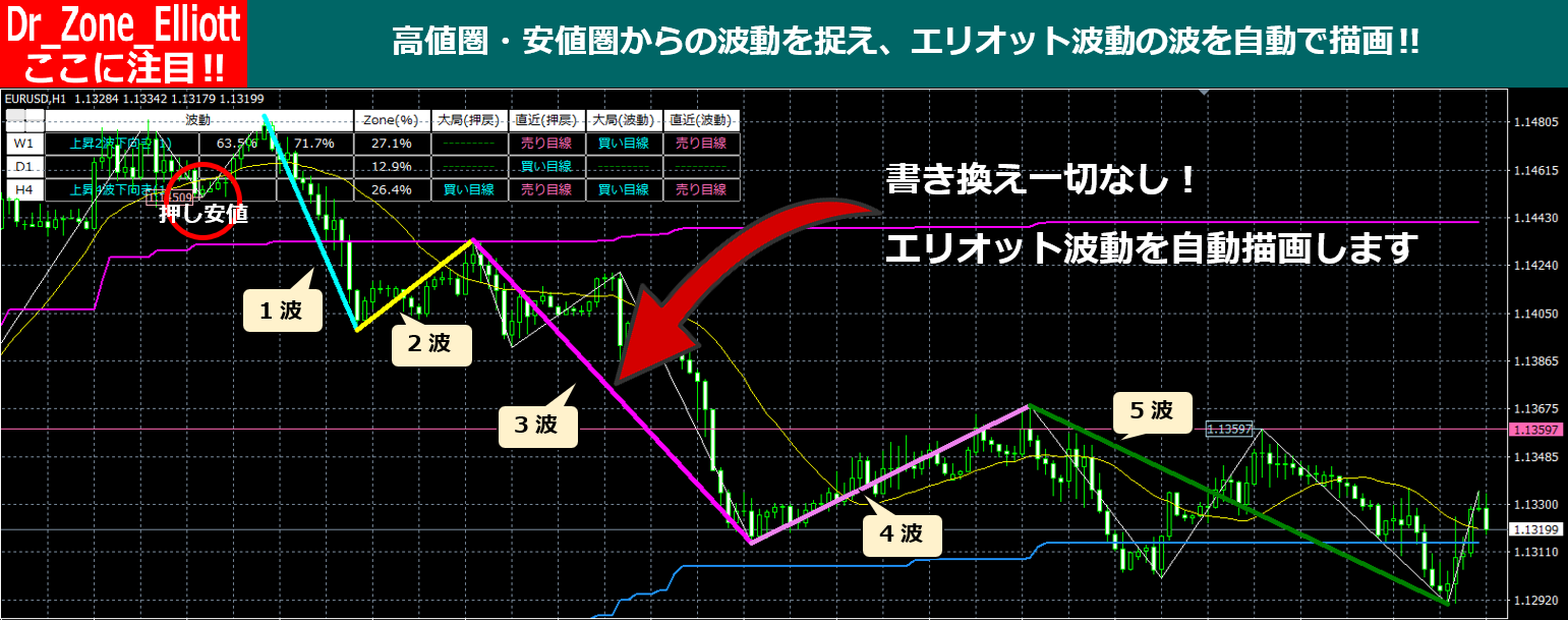 Dr_Zone_Elliottは、高値圏から押し安値をブレイクして発生する下降1波、安値圏から戻り高値をブレイクして発生する上昇1波として捉え、その後の波を自動で描画します。