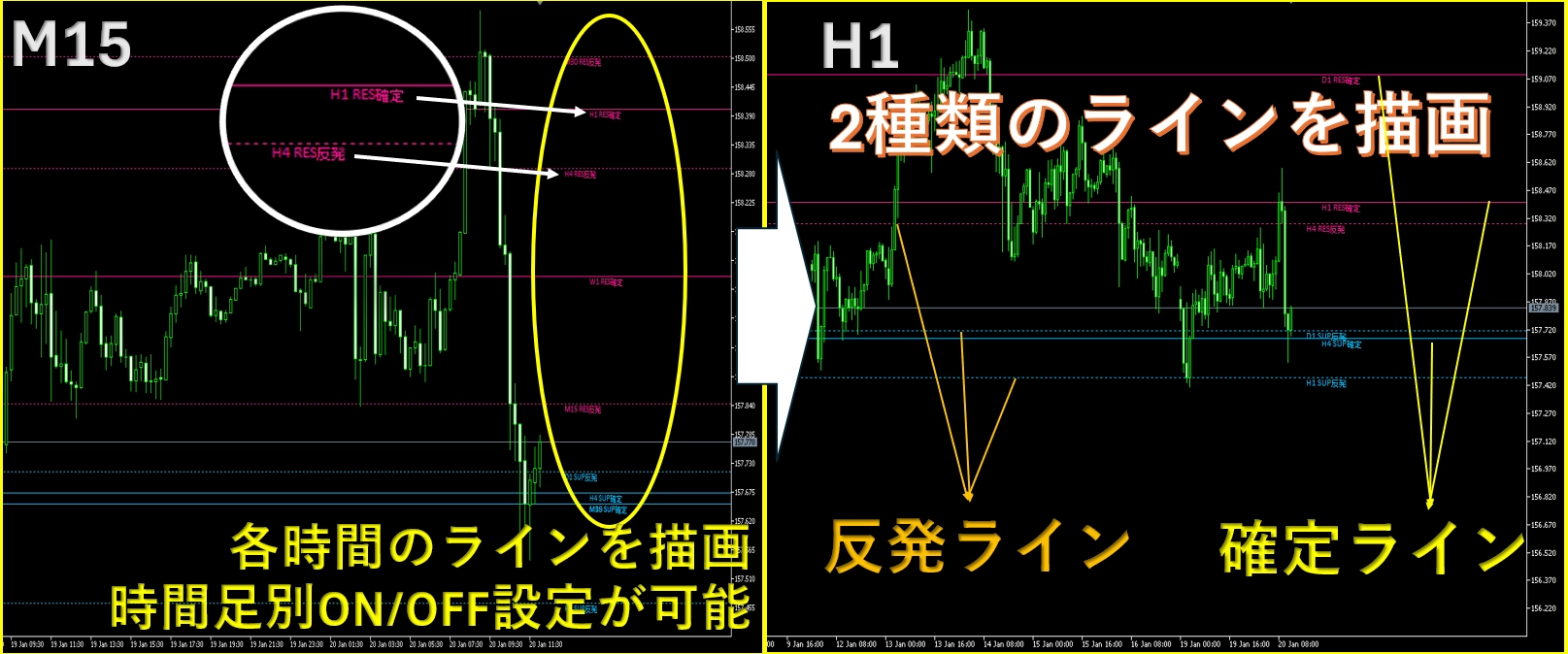 M1〜MN1までの複数時間足のサポート&レジスタンスを、全自動で水平線表示します。