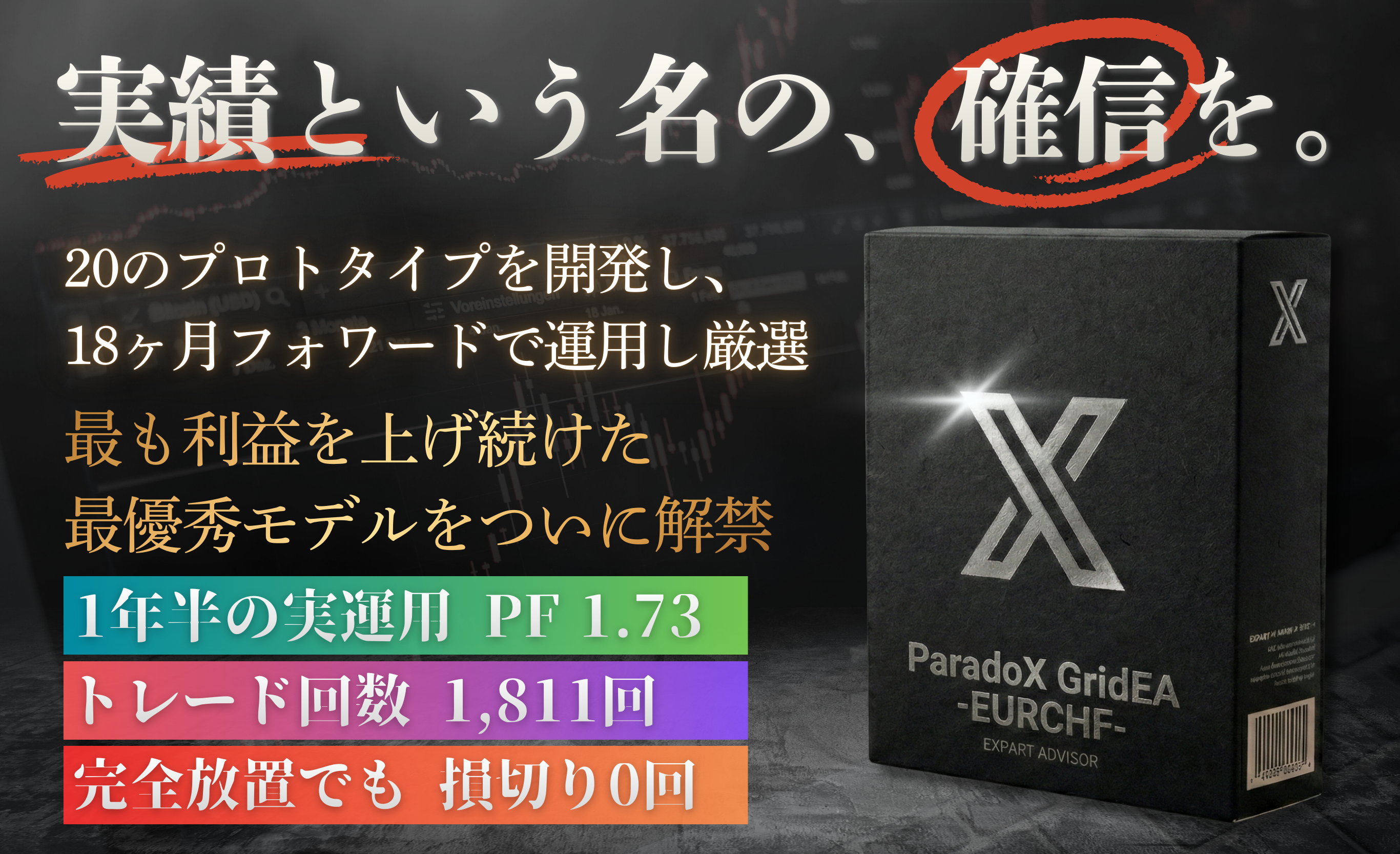 ユーロとスイスフラン。この2通貨は経済的な結びつきが極めて強く、強力な相関関係にあります。結果として、価格は一定のレンジ内に収束しやすく、ParadoXの戦略にとって「最も安全で、最も稼ぎやすい戦場」となります。