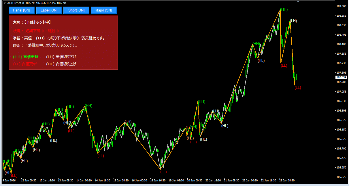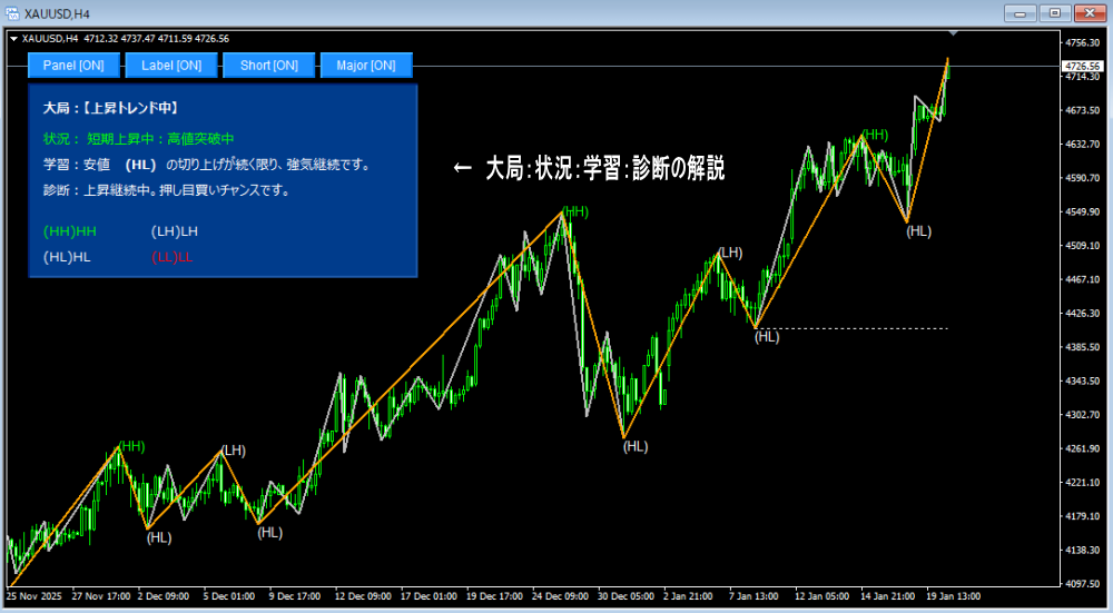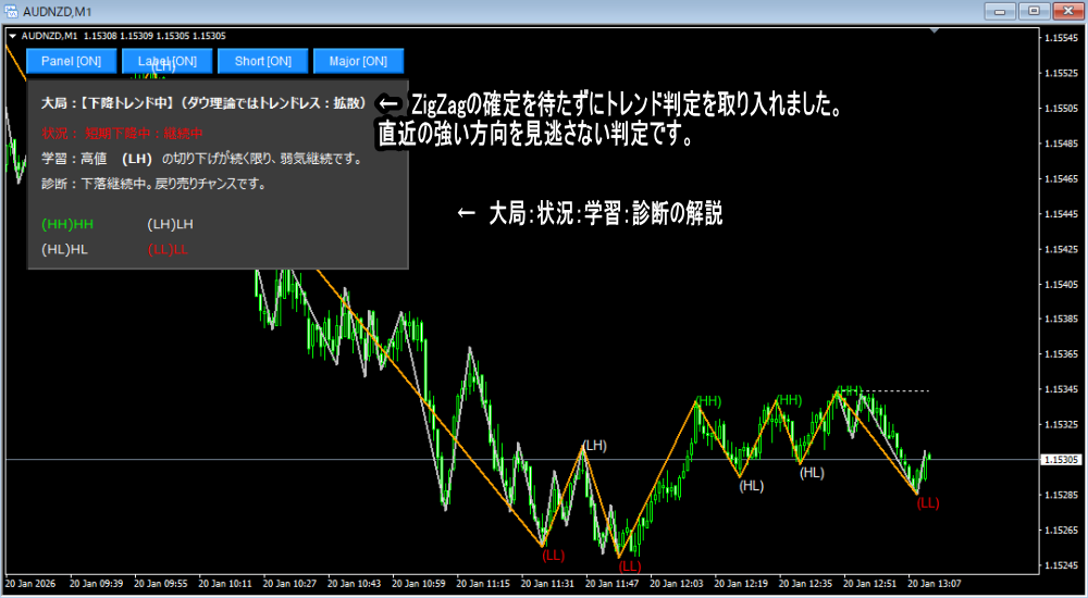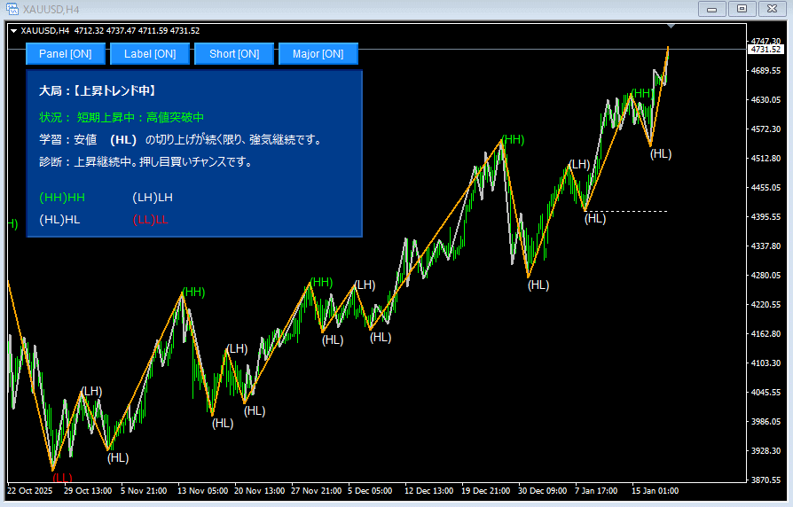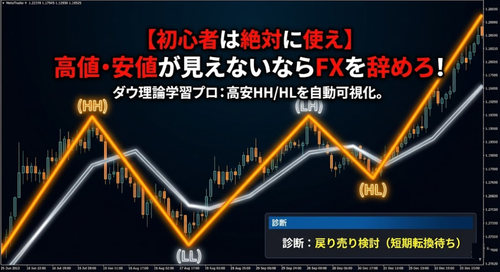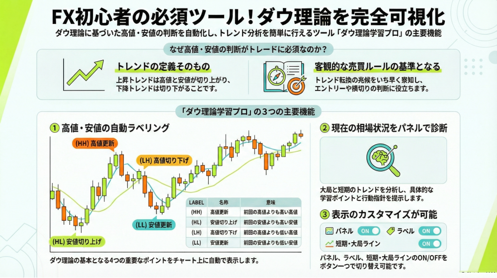 ダウ理論を可視化する:高値安値HH/HL自動表示「短期・大局トレンド一致診断ツール」