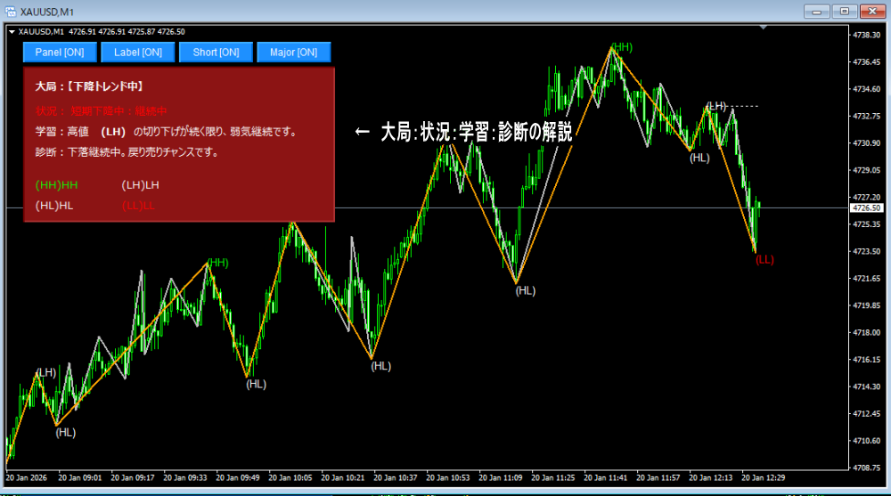 - ● 結局、自分の判断に自信が持てない 高値・安値をプロと同じ基準で自動可視化。診断パネルがあなたの背中を押し、無駄なトレードを制止します。