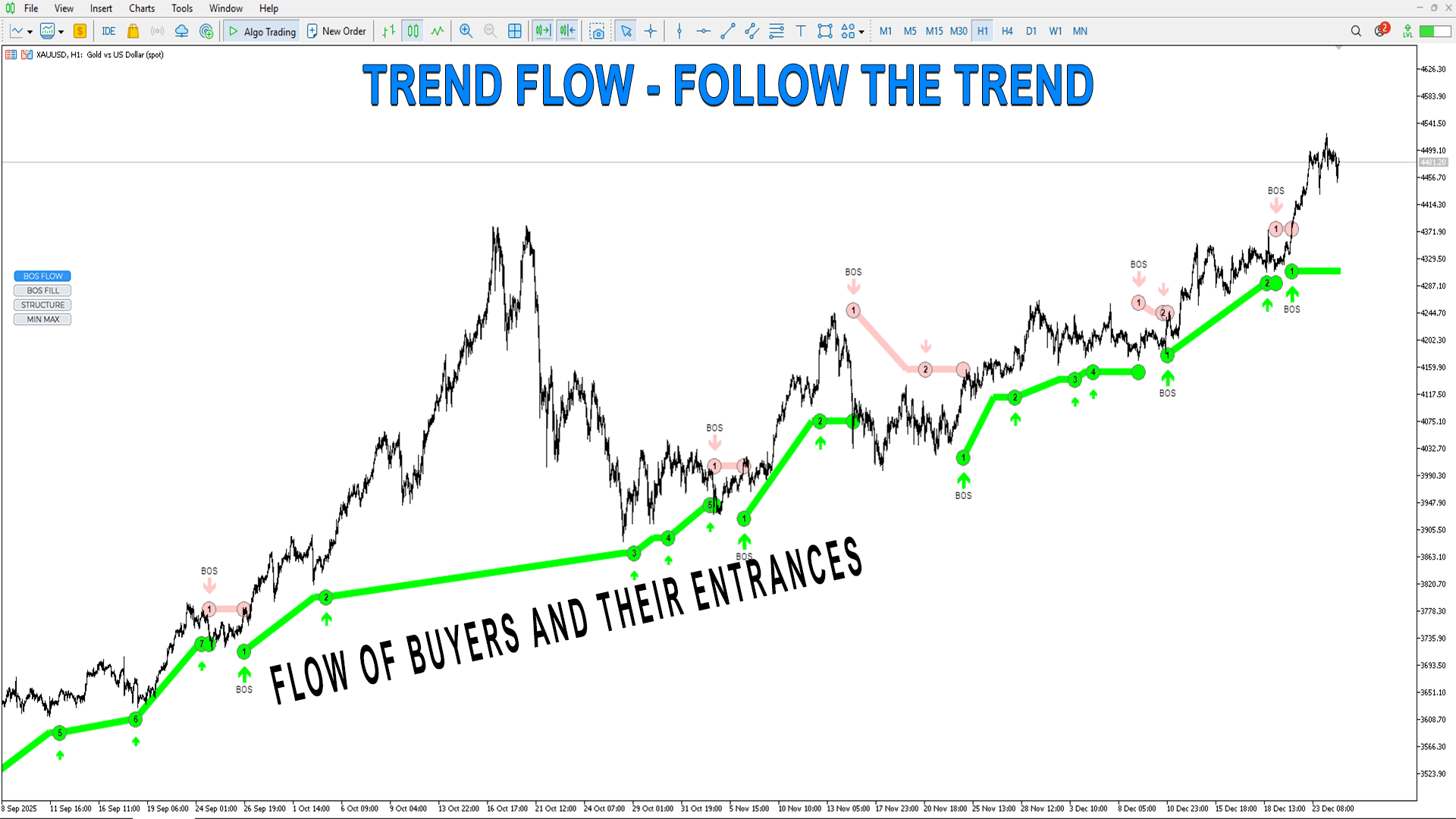 BOS FLOW– トレンド波と実際のトレンド変更、これらは主要プレイヤーのエントリーと存在の確認(数字で表示されます)。