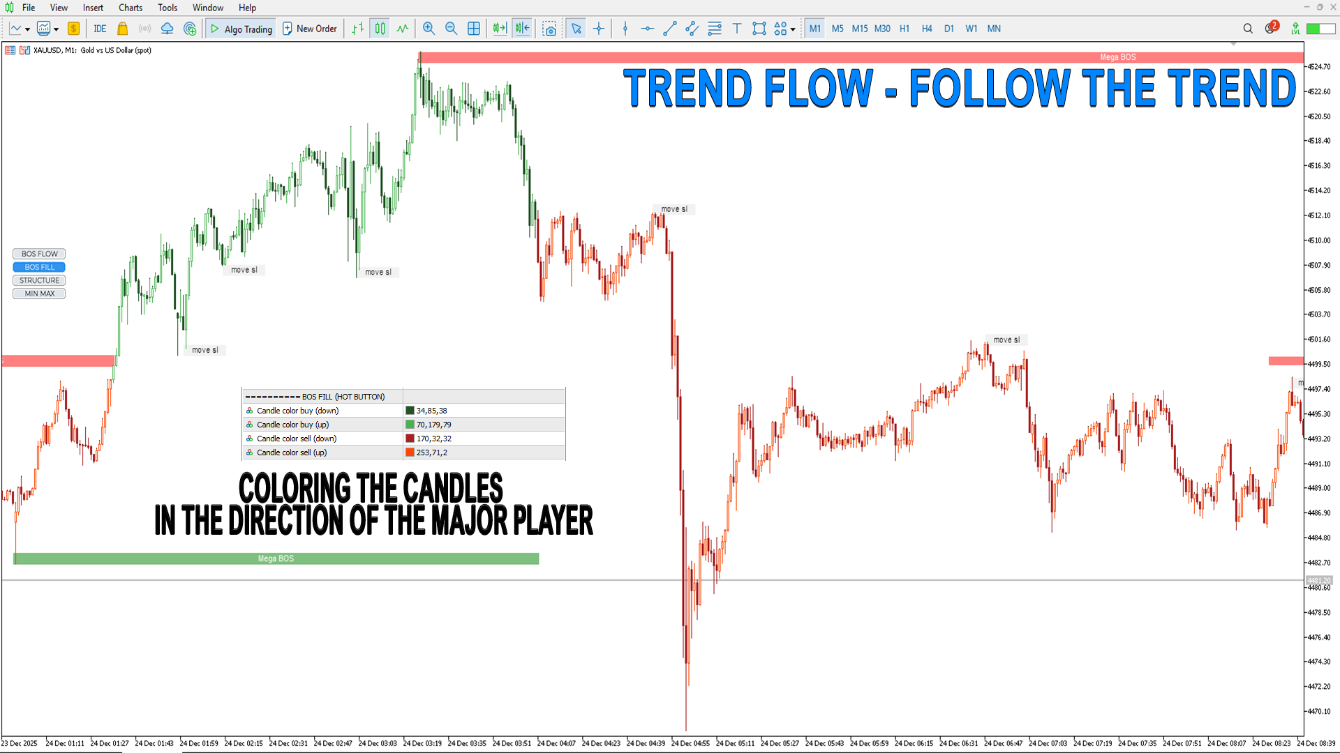 BOS FILL– トレンド方向に沿ってバーを埋める。これにより「主要プレイヤー」のエントリーポイントとトレンド転換を示します。