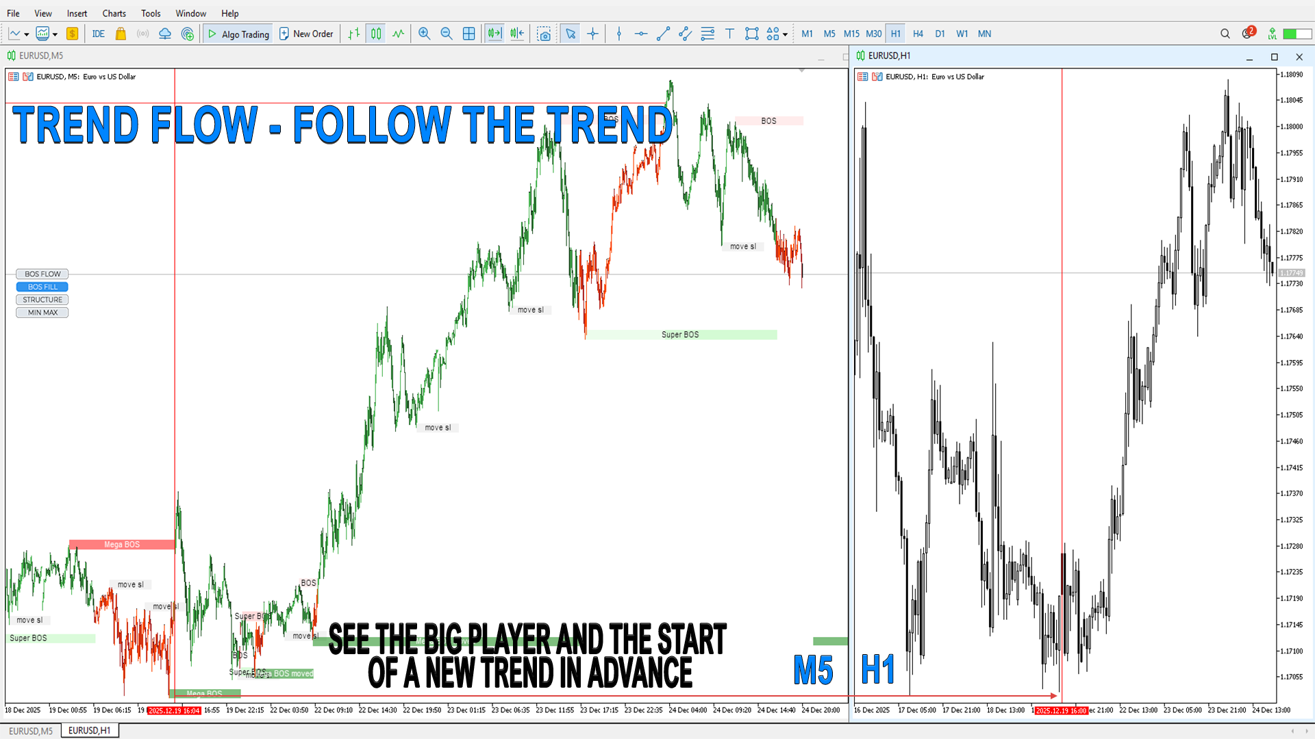 チャート上のBOSマークは高時間足での真のトレンド変化と主要レベルを表します。データは再描画されず、各バーの確定後もチャート上に残ります。
