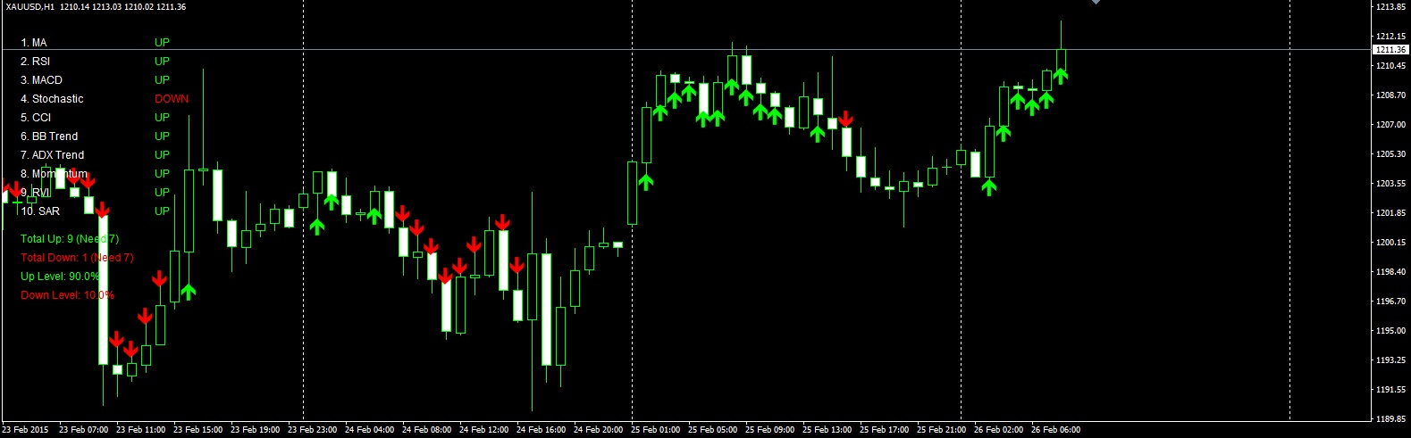 - 上矢印(Lime): 設定した%以上のインジケータが「UP」を示した時に点灯。
