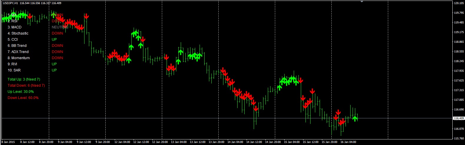 - 下矢印(Red): 設定した%以上のインジケータが「DOWN」を示した時に点灯。