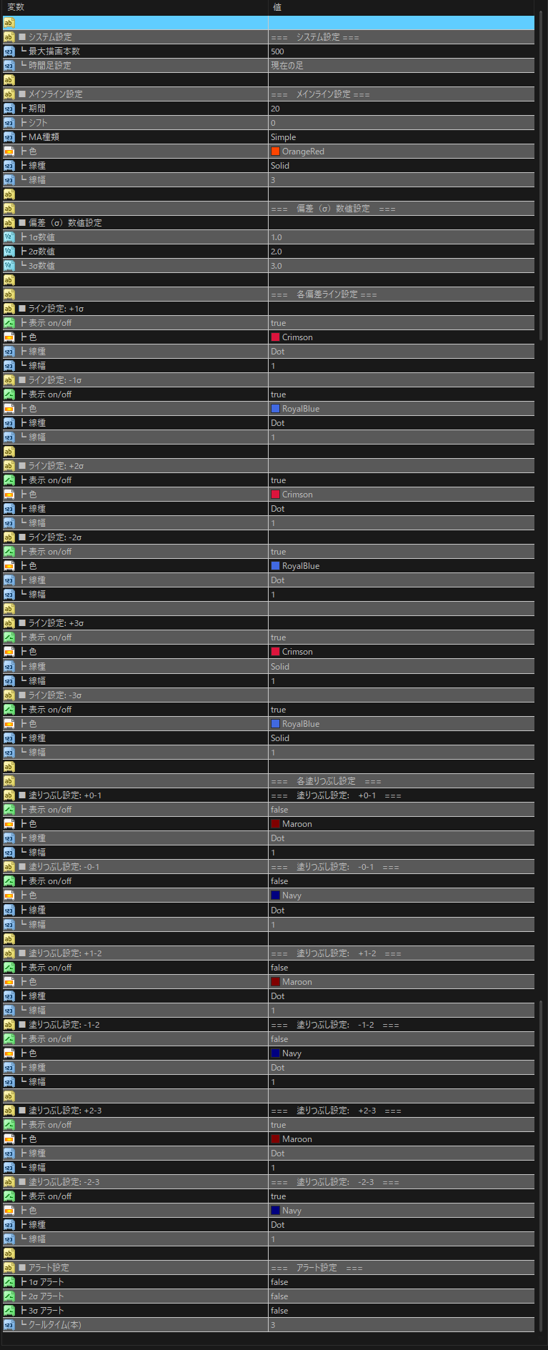 メインラインの線種の変更、各偏差間を塗りつぶし、マルチタイムフレーム機能。