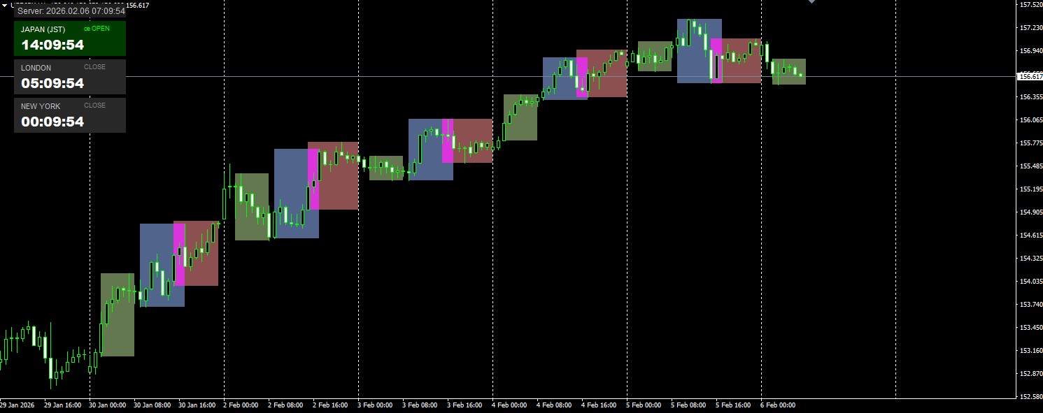 チャート上に「現在の各市場の時間」を表示するデジタルパネルと、各市場の「値動きの範囲(高値・安値)」を示すボックスを描画します。
