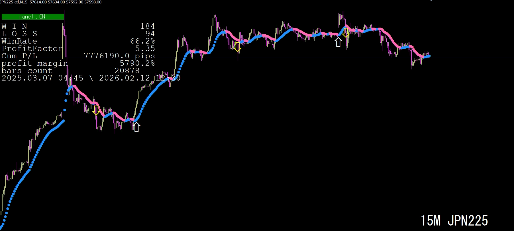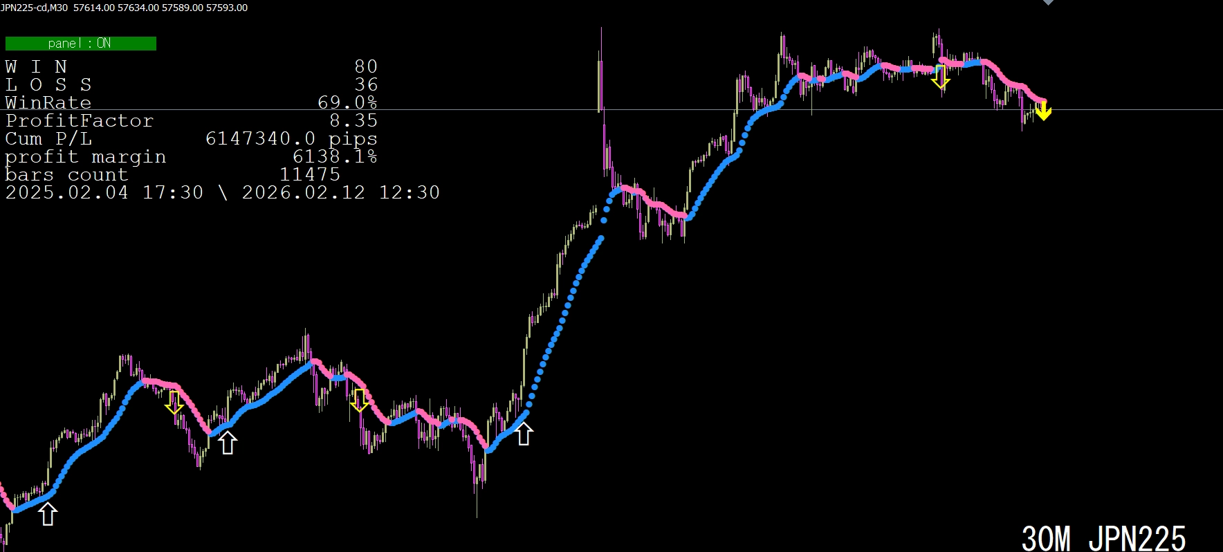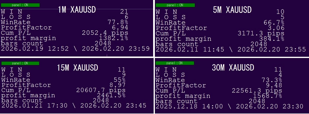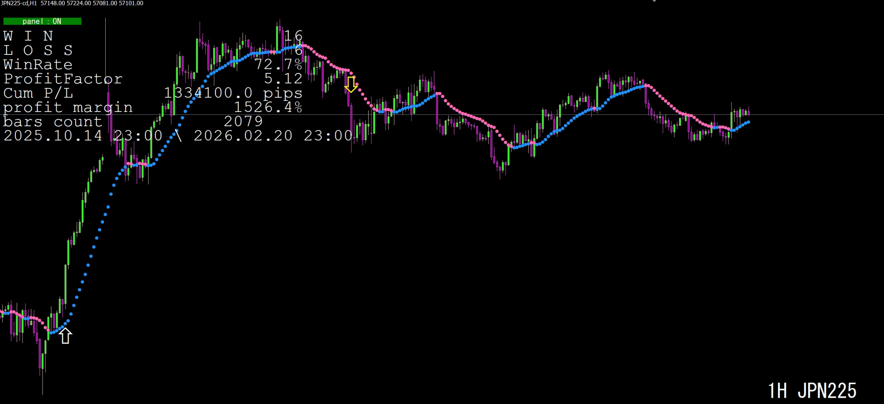 画面左上に、勝敗など多くの情報パネルが表示されますので、参考にしてください。なお、このパネルの表示は、パラメータ画面で、非表示にすることもできます。詳細は画像で確認してください。損益は、スプレッド分を控除した約定価格ベースで計算されています。
