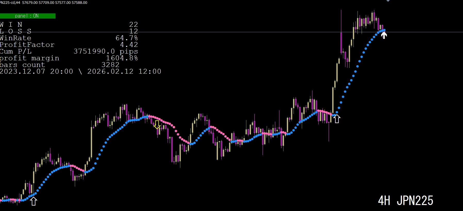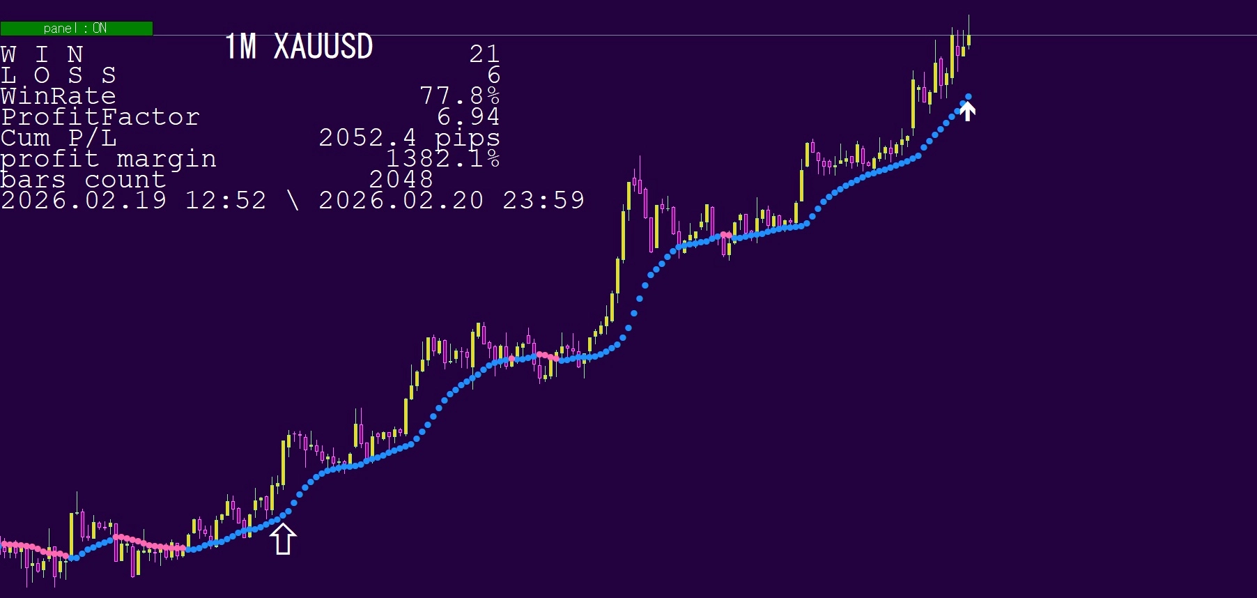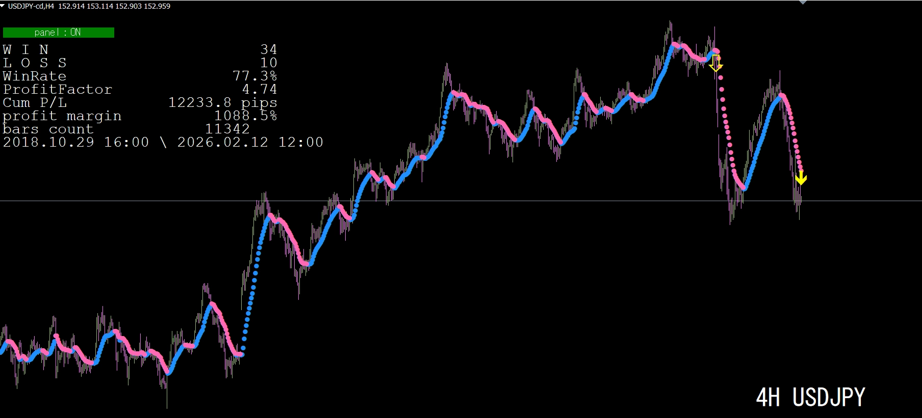 画面左上に、勝敗など多くの情報パネルが表示されますので、参考にしてください。なお、このパネルの表示は、パラメータ画面で、非表示にすることもできます。詳細は画像で確認してください。損益は、スプレッド分を控除した約定価格ベースで計算されています。