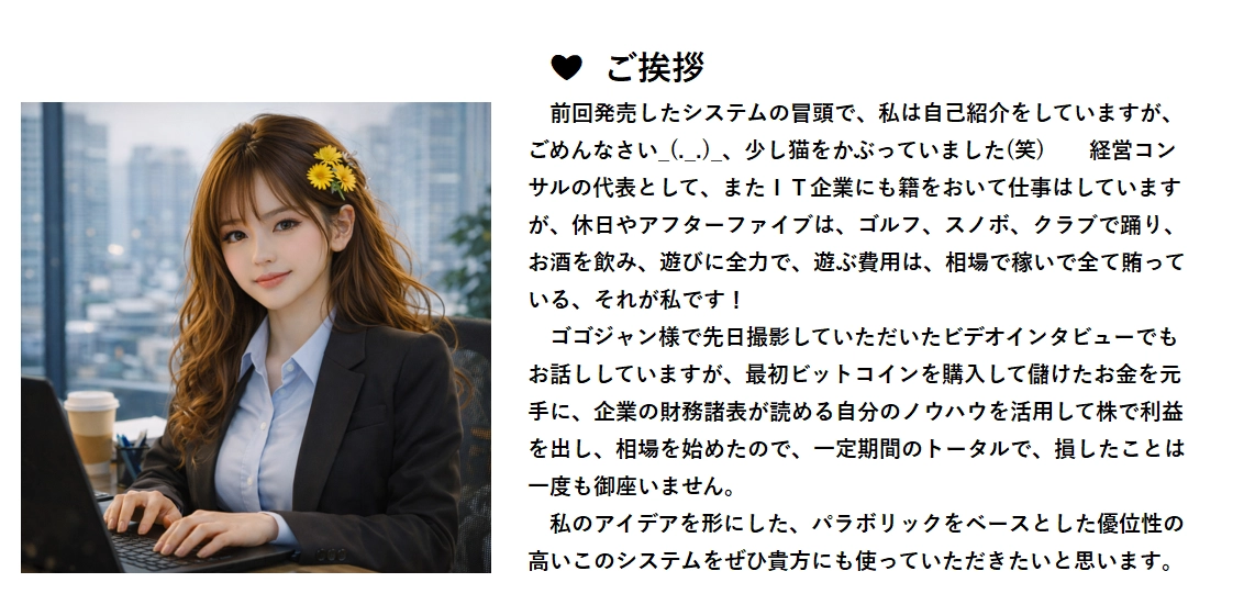 このシステムは、サインに従って取引するだけでも利益が出せるような仕様になっています。実際に私が使って普通に利益が出ているので、自信を持ってそう言えます。 でも、それでは貴方の考え方は? 貴方はどこにいるの? 皆さんは、AIがいくら優秀だからと言って、AIの言いなりになりますか? コンサルがいくら有能だからといって、コンサルの言うとおりに経営判断しませんよね? そうです、相場においても、システムのシグナルと、貴方の見方が一致した時に、自信を持ってエントリーするのが、最も効果的です。システムと貴方の考え方が一致したら、そうです、その時は自信を持って、「相場でGo!」です。システムと貴方の二人三脚です。それが最も効率が良い方法だと私は思っています。勿論、私はシステムの指示通りにやっても、確かに利益が出ることは確認しています。それでも、私は、自分の見方も大切にしていて、頼れる相棒と二人三脚で楽しく相場をやっています💖 このシステムは、パラボリックをベースとして作られているため、流れに乗るのが簡単で、大きな損失が発生することがないため、初心者の方にもお勧めのシステムです!