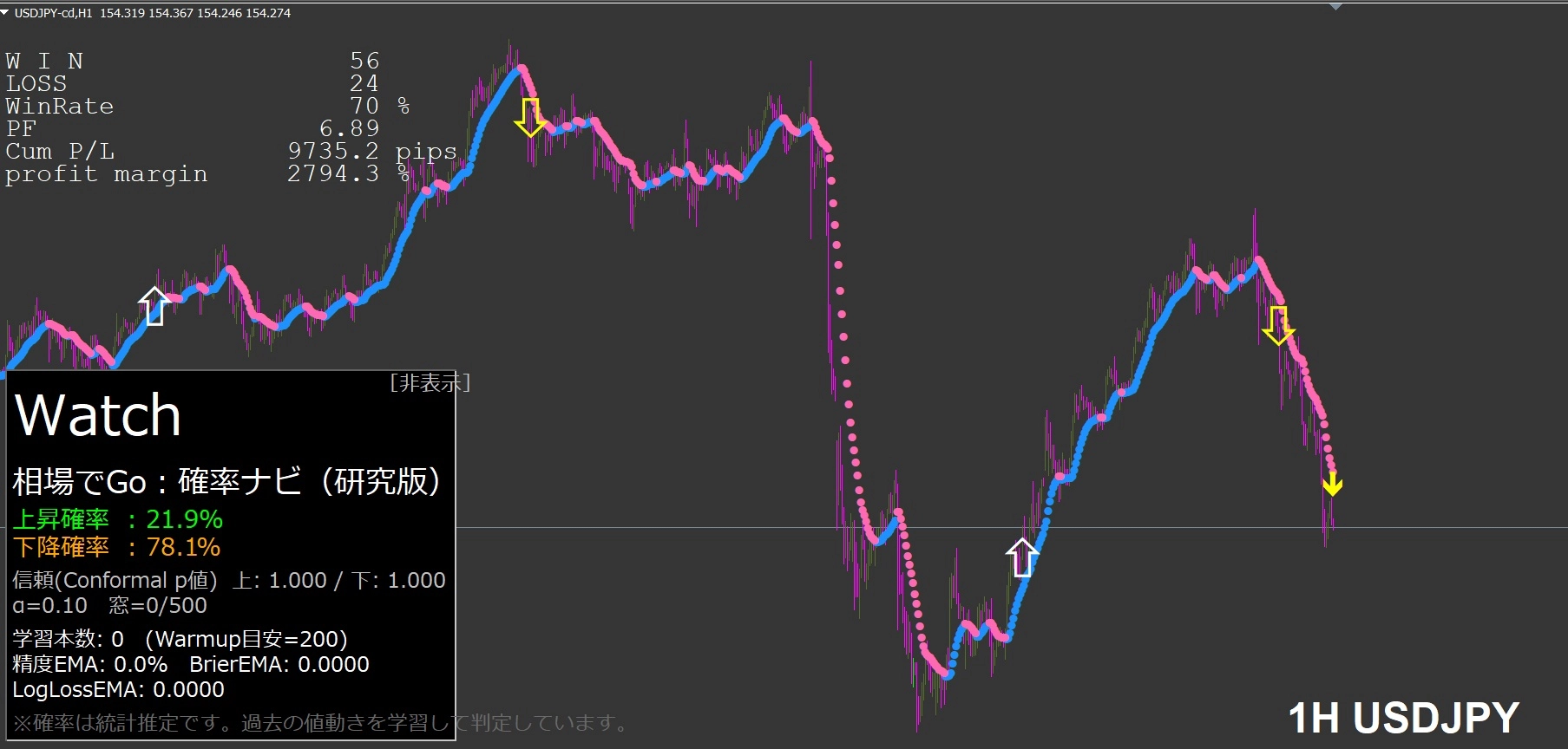 次のローソク足が陰線か陽線か、未来を予測する、自動学習/上昇・下降確率表示プログラム、相場レーダー「確率ナビ」が過去の相場をツールが自分で学習してサインを出す仕組みの詳しい説明は、このページの最後に掲載しています。(確率ナビの表示は、ナビの表示蘭の右上の[表示][非表示]ボタンをクリックして、表示・非表示切替できますので、チャートの邪魔になりません。)