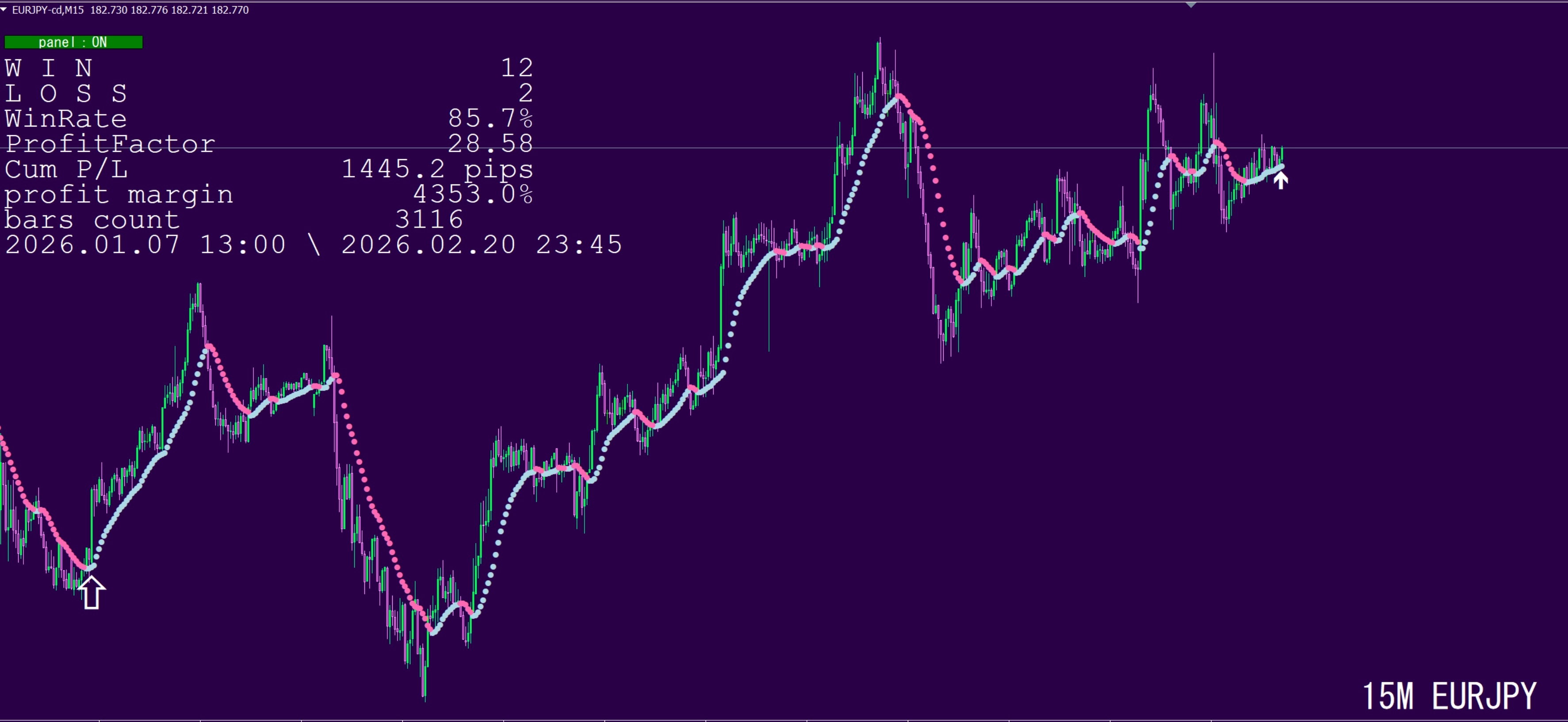 トレンド転換の時には大きな矢印が出ますが、現在バーの所には、最新の状況をお知らせする小さな矢印がでます。でも、最後に出たトレンド矢印と反対方向にチャートが動き出すと、矢印は表示されなくなりますから、決済判断しやすいです。