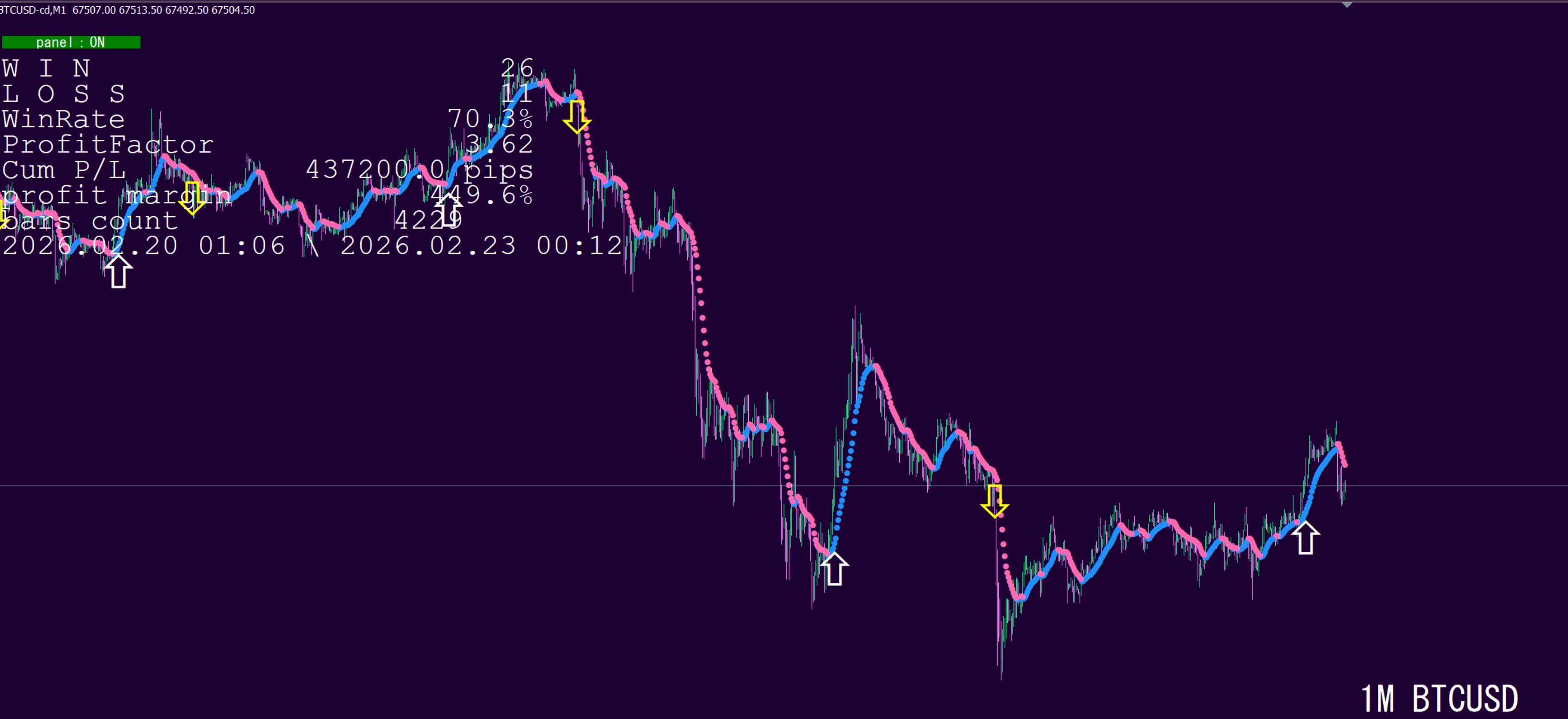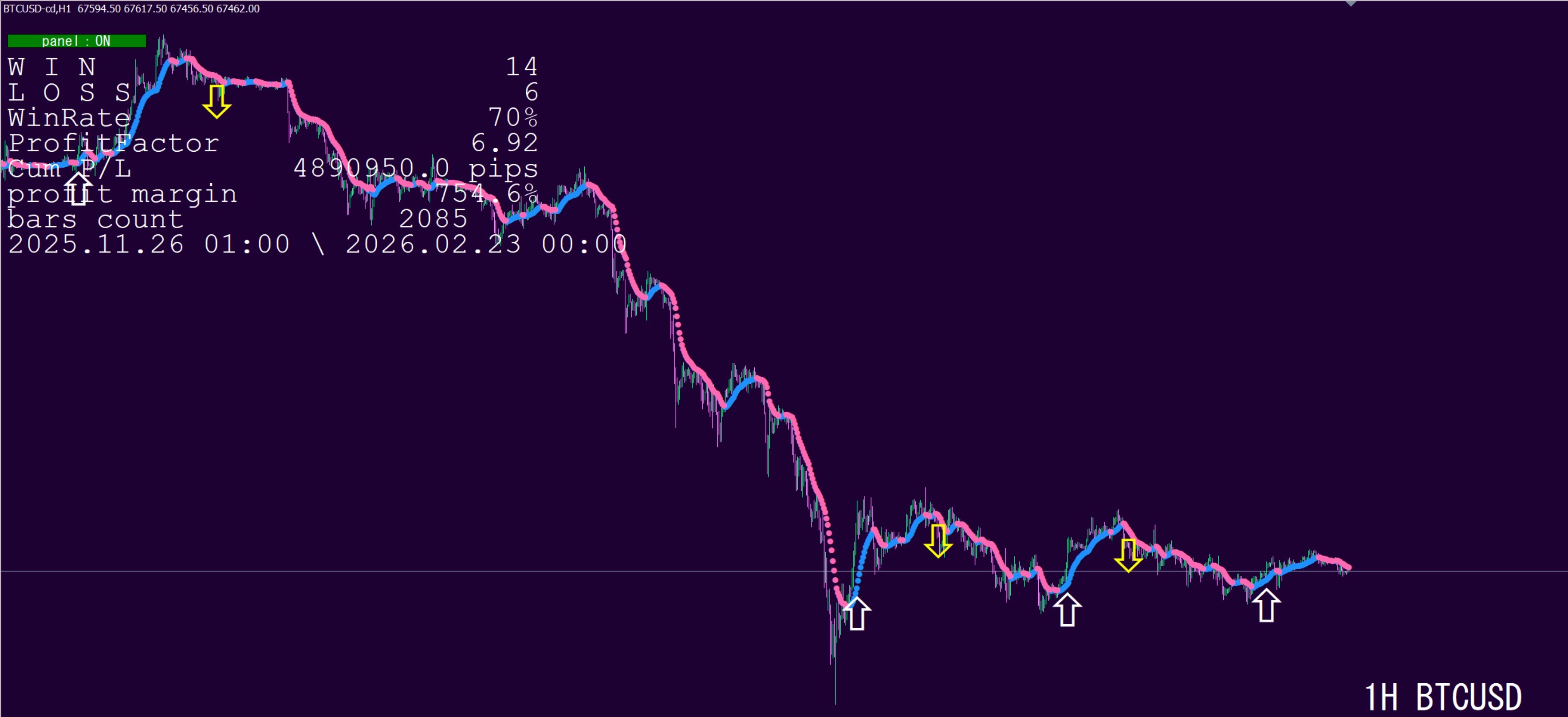 一度出た矢印は消えたり動いたりしません。再起動しても同じ。トレンドの変化を見つけて、早めに売り買いの矢印を出します。どの時間足でも安定しているのが特徴です。矢印サインは今動いているバーに表示され、アラートや通知もでます。
