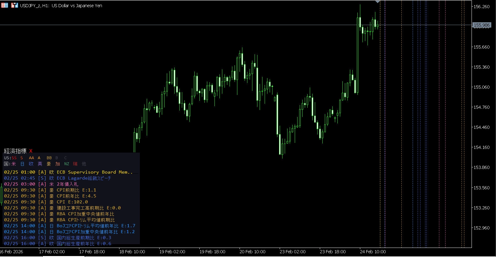 5. チャート上の縦線表示 経済指標の発表時刻にチャート上で縦線を自動描画。ローソク足のどこで指標が発表されたか視覚的に把握できます。ON/OFF切り替え可能。