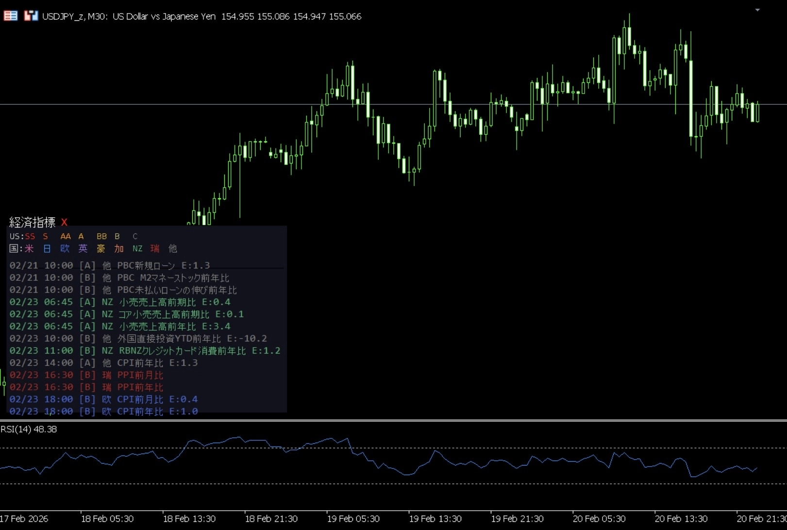 1. チャート上にリアルタイム表示 MT5内蔵の経済カレンダーデータを使用。今日〜直近の経済指標を日本時間で一覧表示します。ブラウザを開く必要は一切ありません。