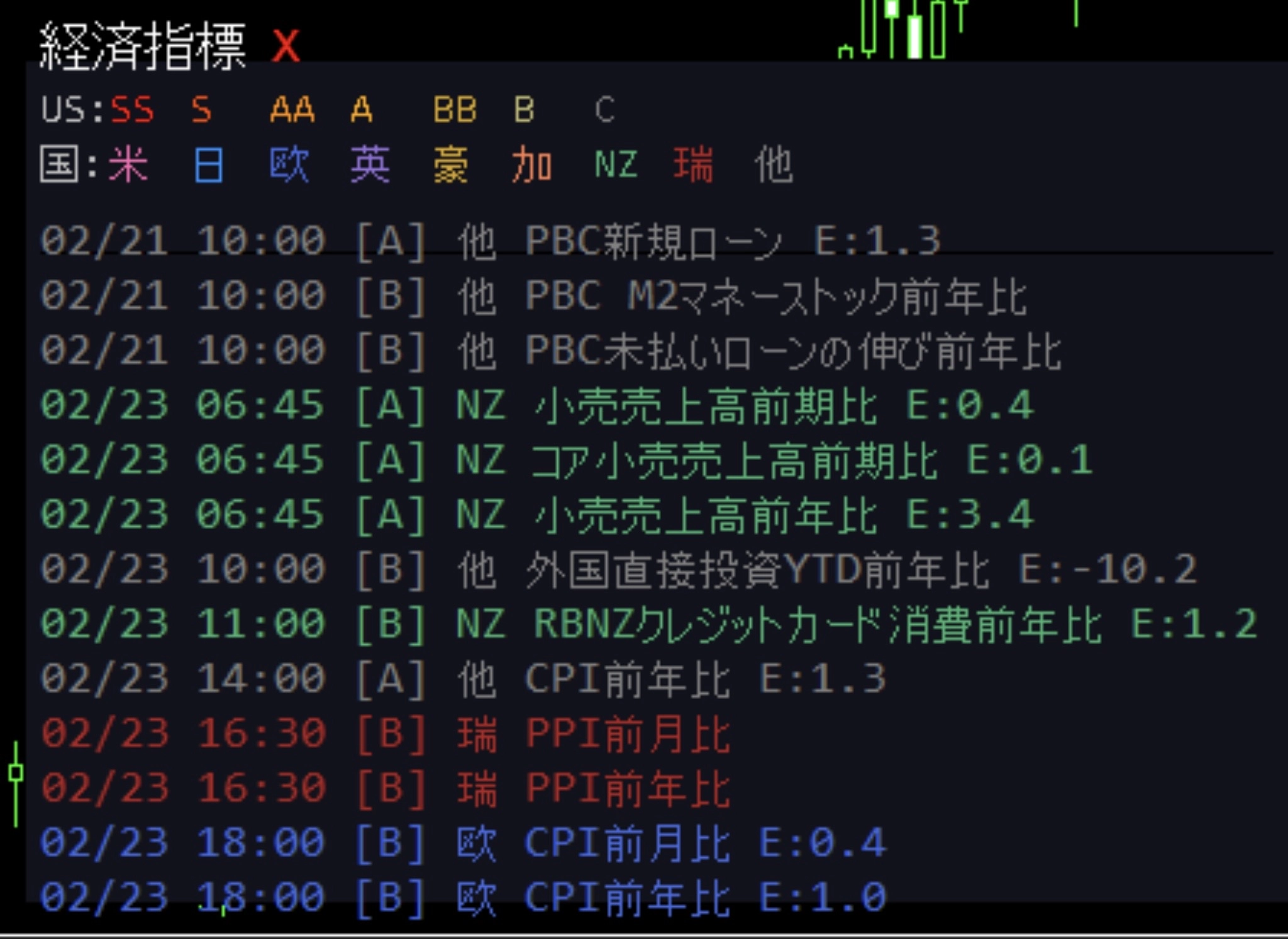 SS = 最重要(FOMC、雇用統計) S = 重要・高(CPI、GDP、PCEデフレーター) AA = 重要・中高(ISM製造業、小売売上高) A = 普通(ミシガン大学消費者信頼感指数) BB = 軽め(要人発言、JOLTS) B = 軽微(建設支出、卸売在庫) C = 極軽微(その他マイナー指標)