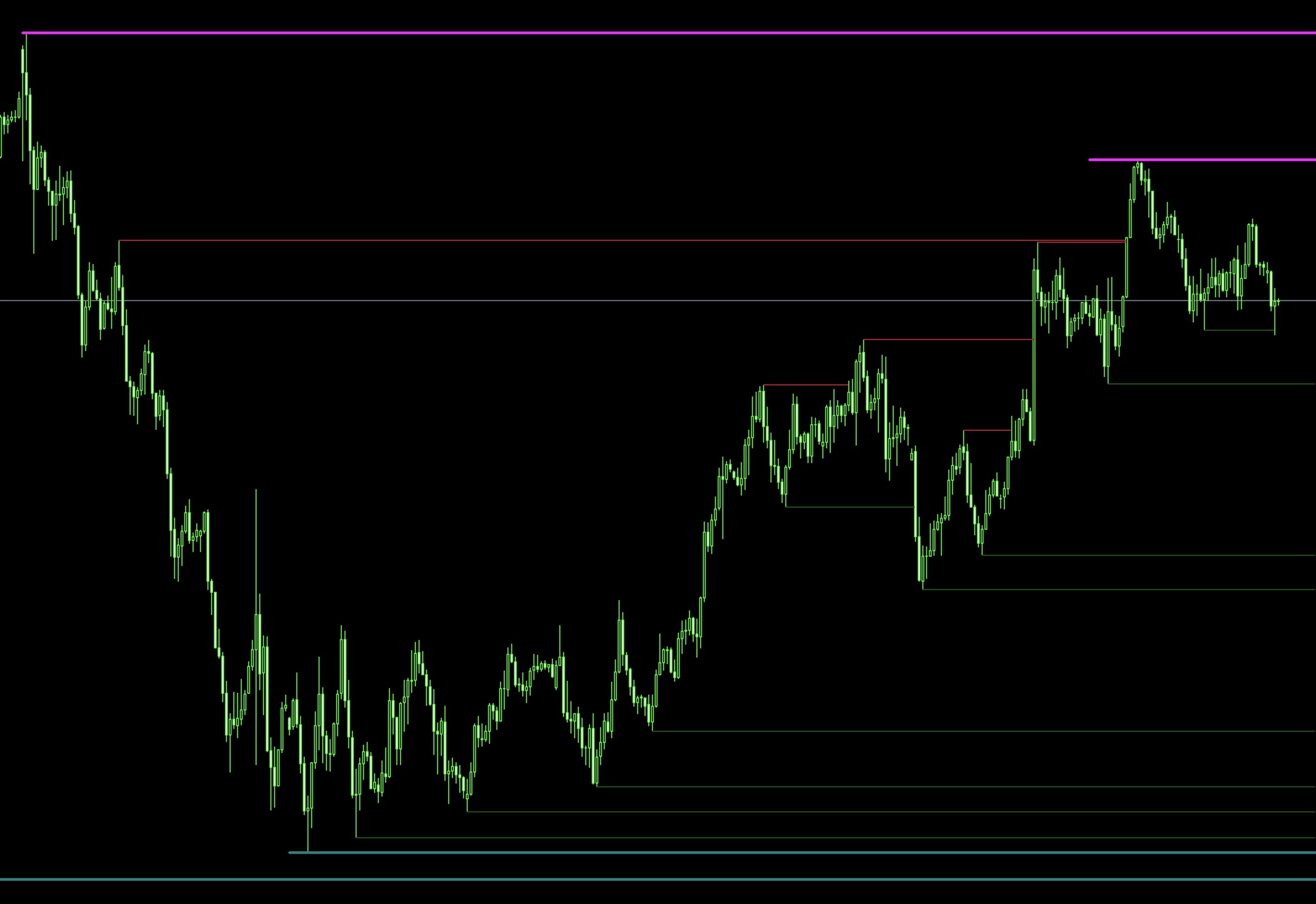 今回開発した「High Low Hunter MTF」は、ここまで勉強を進めてこられて、ダウ理論、ストップロス狩り、エリオット波動、フィボナッチ・リトレースメント、レジサポ転換(ロールリバーサル)、水平線・トレンドライン、スクイーズとエクスパンションなどのキーワードを理解された脱初心者さん、中級者さんのためのツールです。