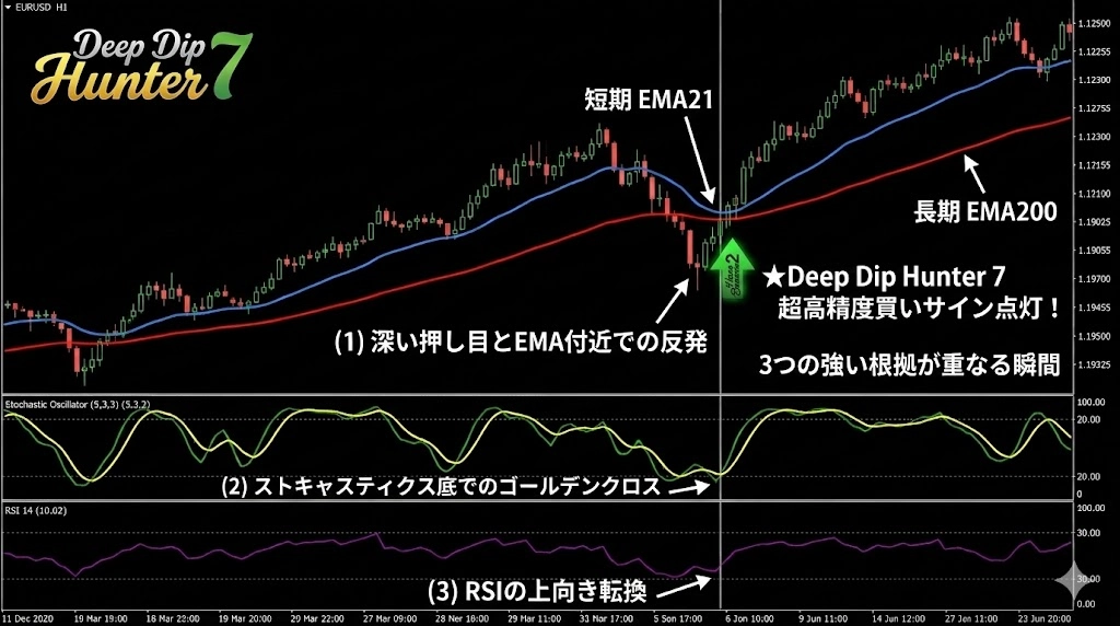 本マニュアルで解説する『Deep Dip Hunter 7』は、その「浅い押し目」という罠を完全にスルーし、プロが待ち構える「深い押し目」だけを冷徹に射抜くための武器です。