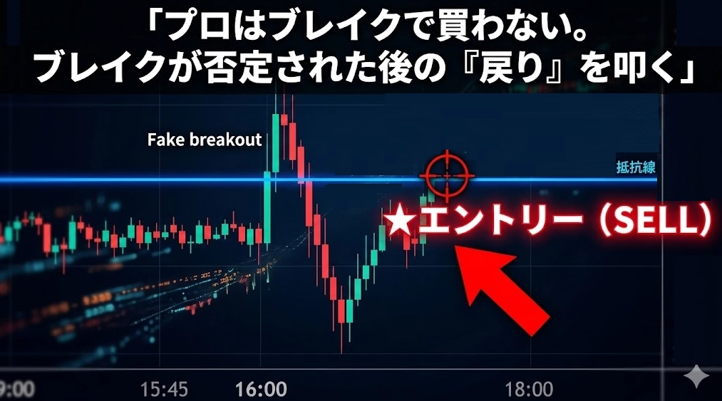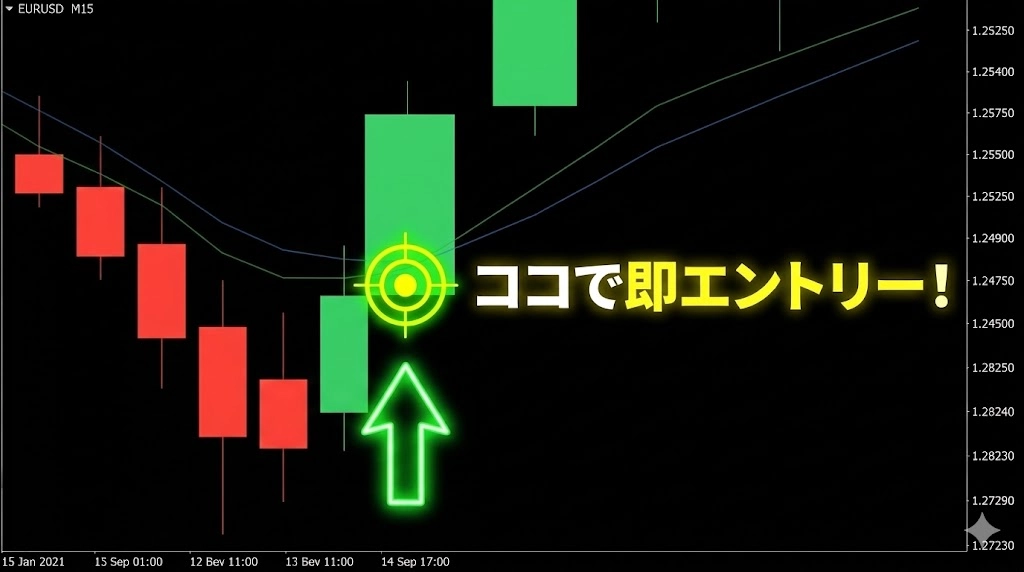強いトレンド中、価格は一直線には進まず、必ず一時的な「行き過ぎた戻り」が発生します。 長期EMAが強い角度で傾いている最中、価格が「ふっ」と短期EMAを逆方向に抜ける瞬間。 初心者が「転換だ!」と慌てるその隙を突き、再びトレンド方向へ向き直った瞬間に一気にエントリーを仕掛けます。