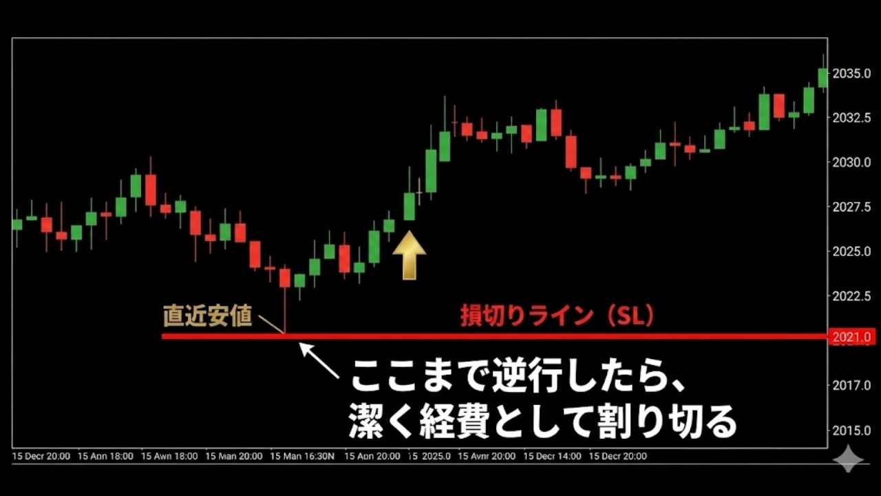 損切りは「負け」ではなく、事業の「必要経費」です。 サインが点灯した直近の「最安値(売りの場合は最高値)」から、少しバッファを持たせた位置に必ずストップロスを置いてください。そこを抜けたら、シナリオ崩壊の合図です。誇り高く撤退してください。
