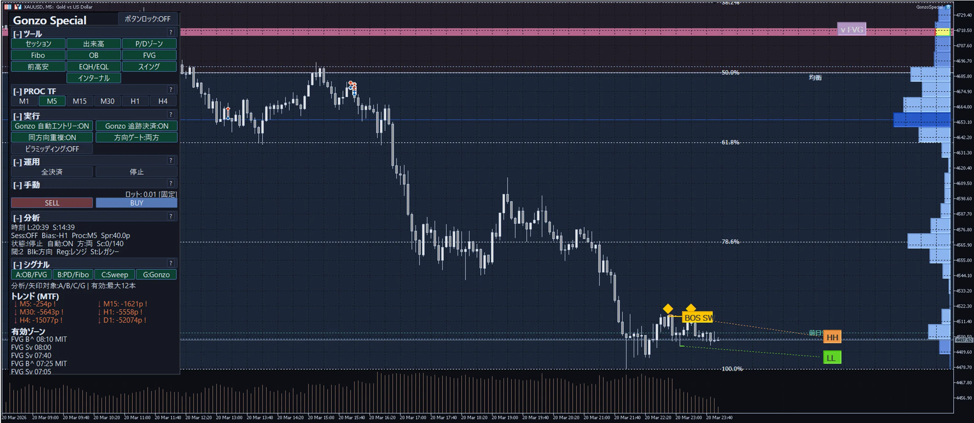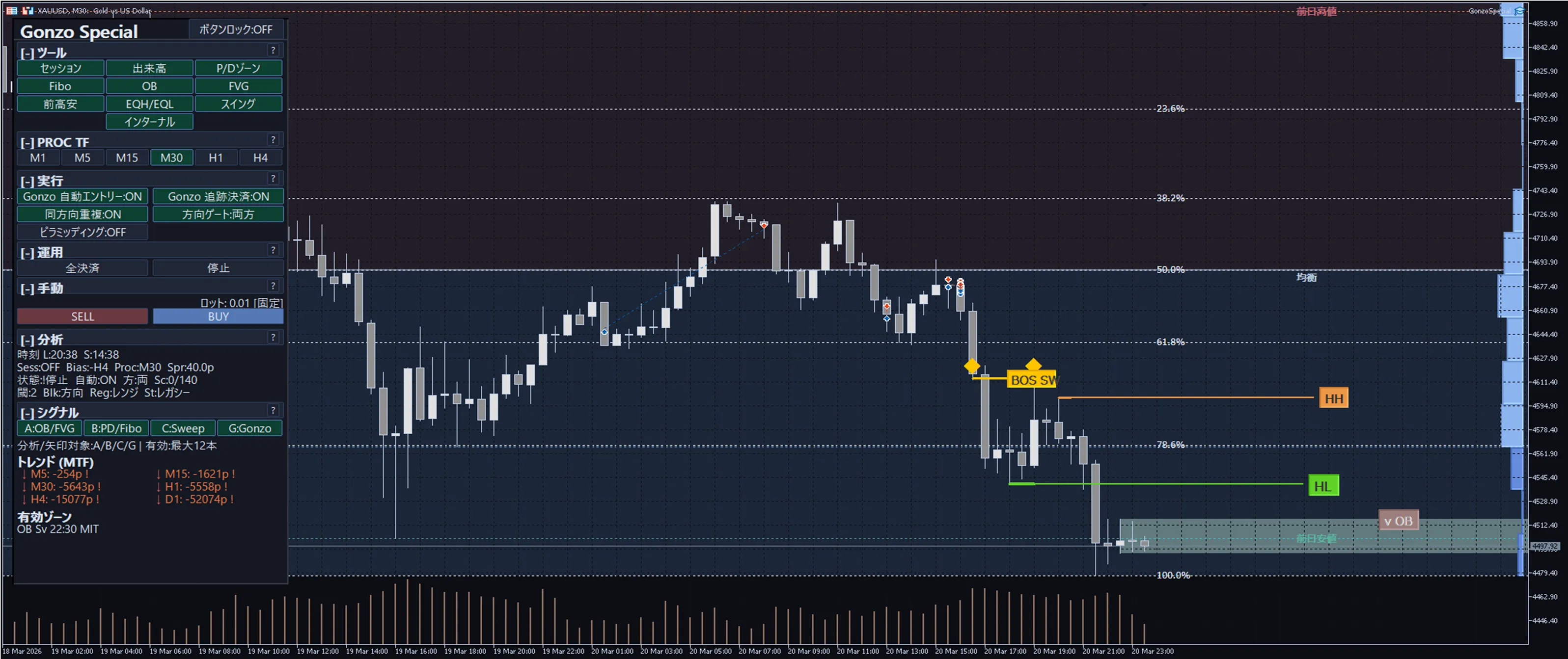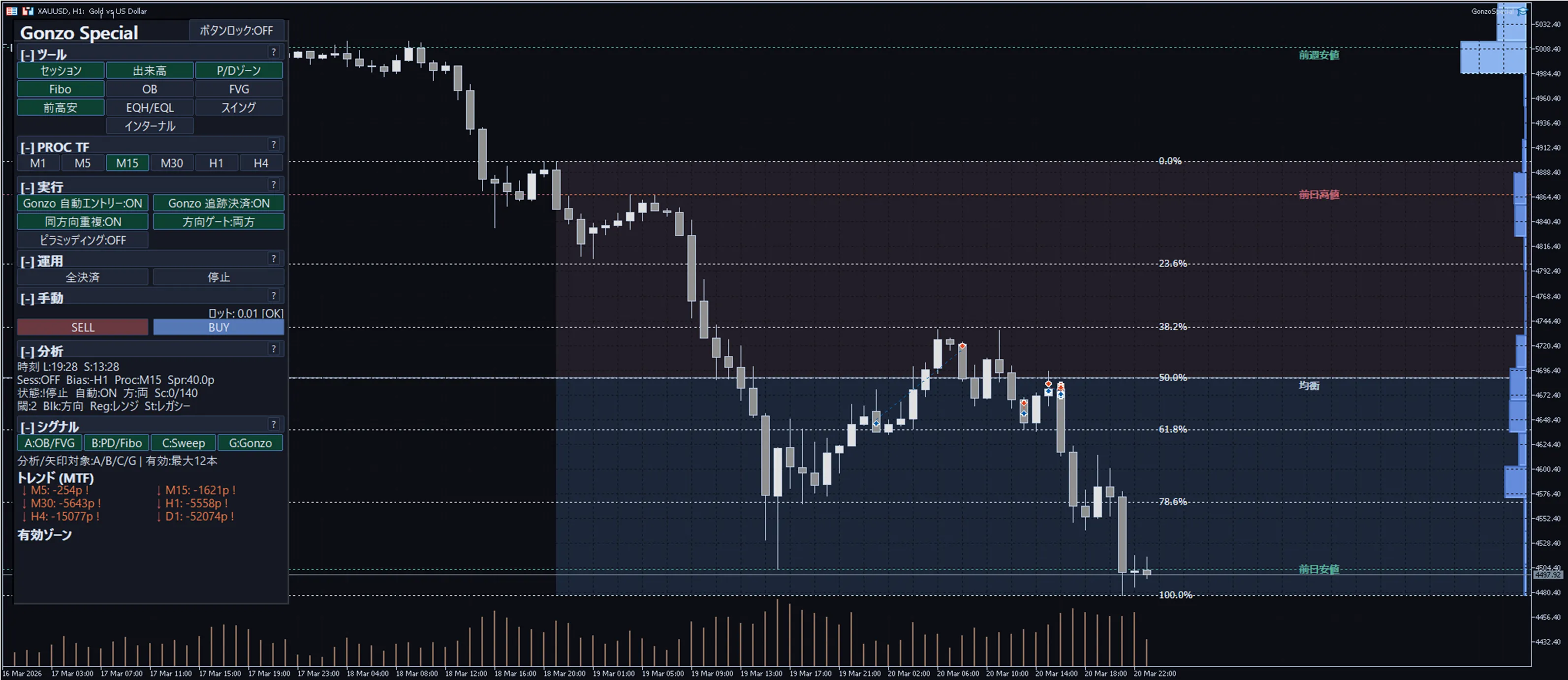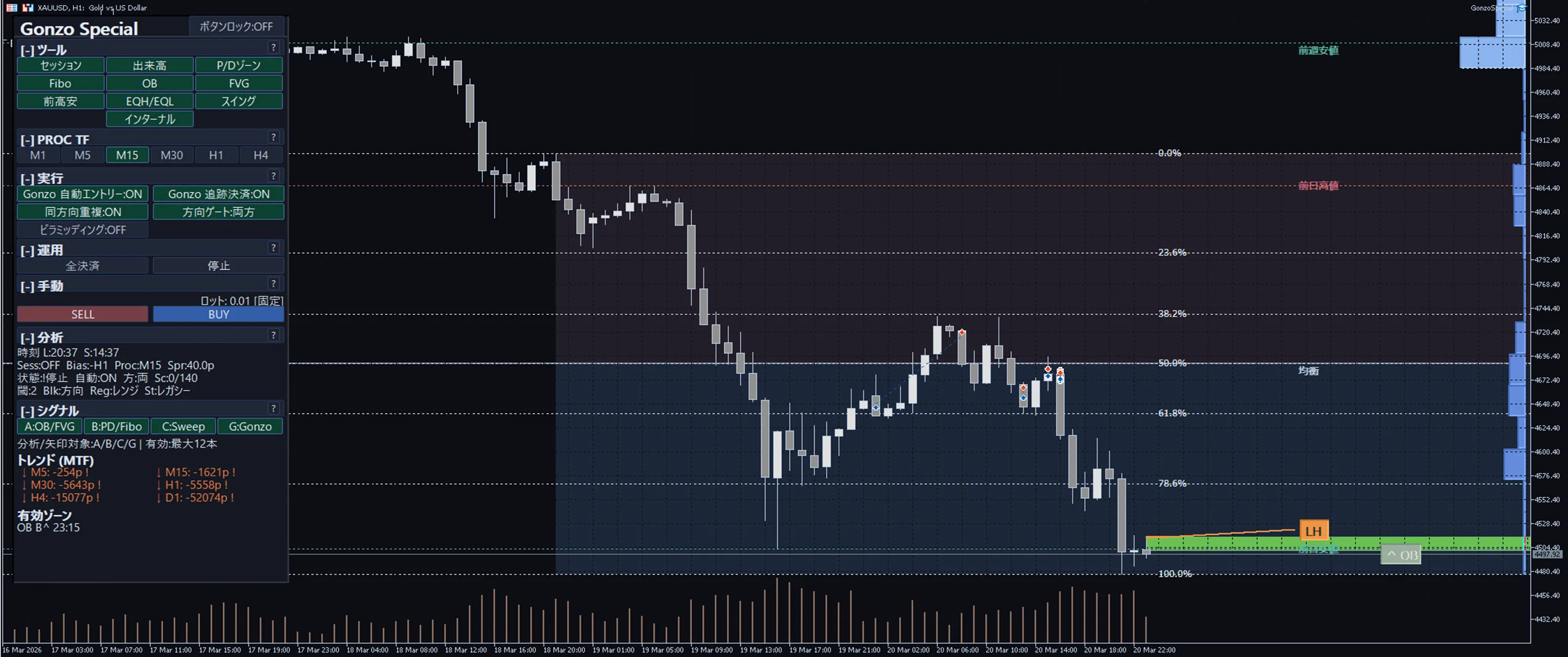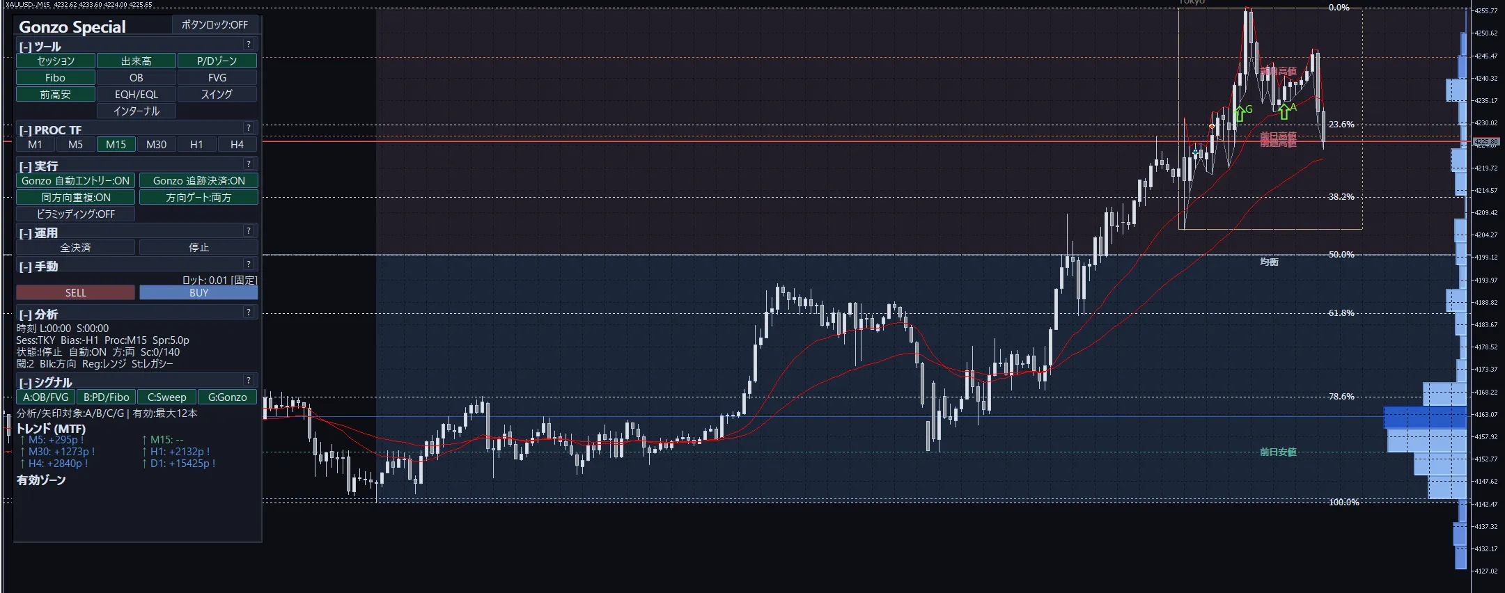 Gonzo Special には、売買だけでなく、相場の見え方を補助する日本語ベースの分析パネルが搭載されています。