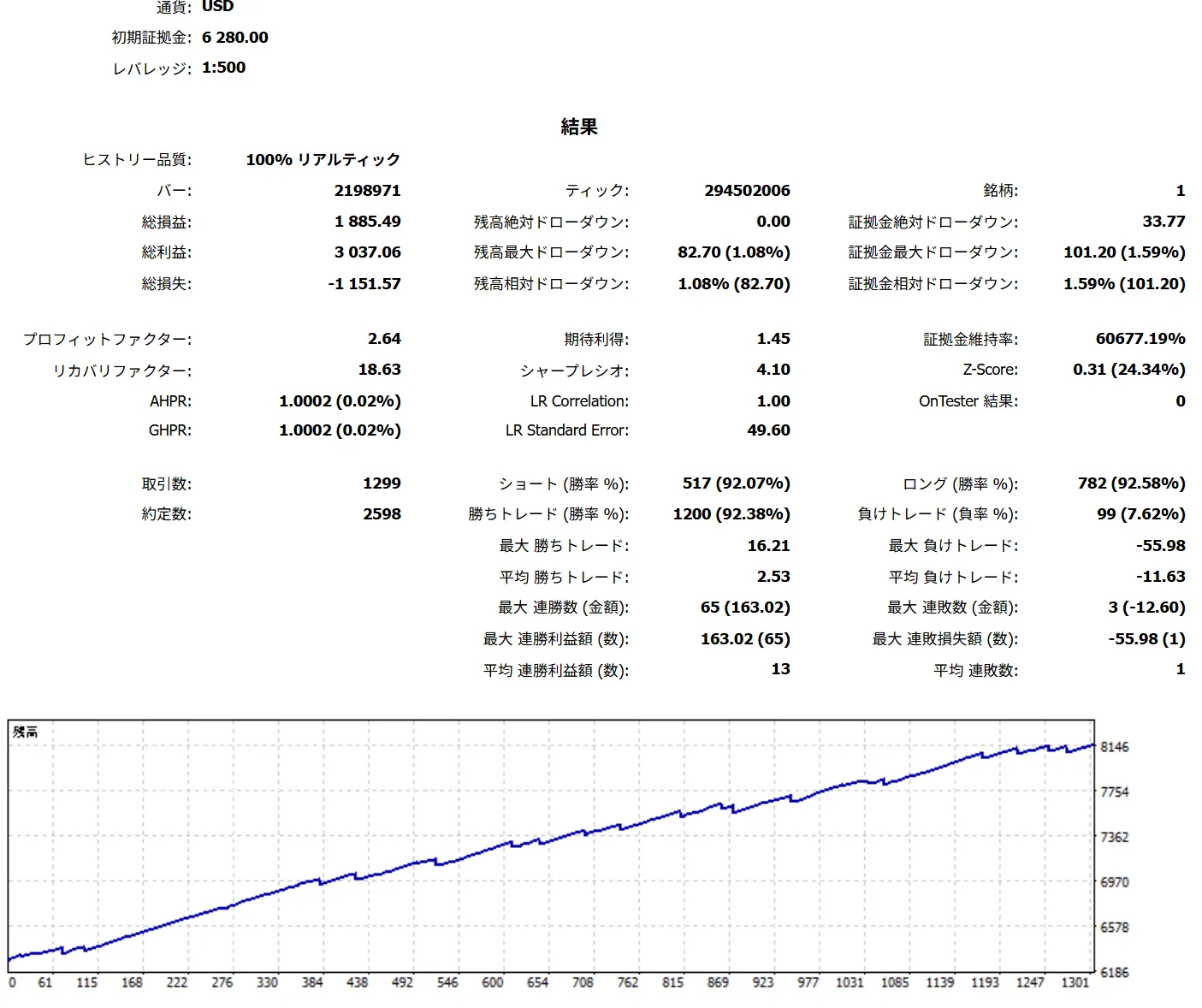 RF 18.63 は、0.01ロット設定で6年以上の検証を行った結果、最大ドローダウンを約100ドル程度に抑えながら、最終的に1,885.49ドルの純益を積み上げた水準を意味します。