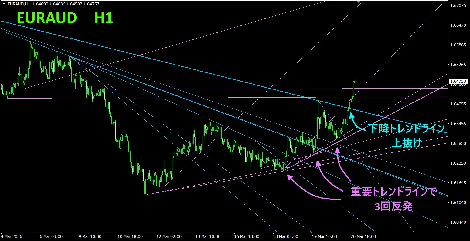 EURAUD時間足チャートに本インジケータを導入した事例を示しますの太線の上昇トレンドラインレートが3回反発していますその後水色の下降トレンドラインを急角度で上抜けしてきたのでこの状況では買いの一択になります