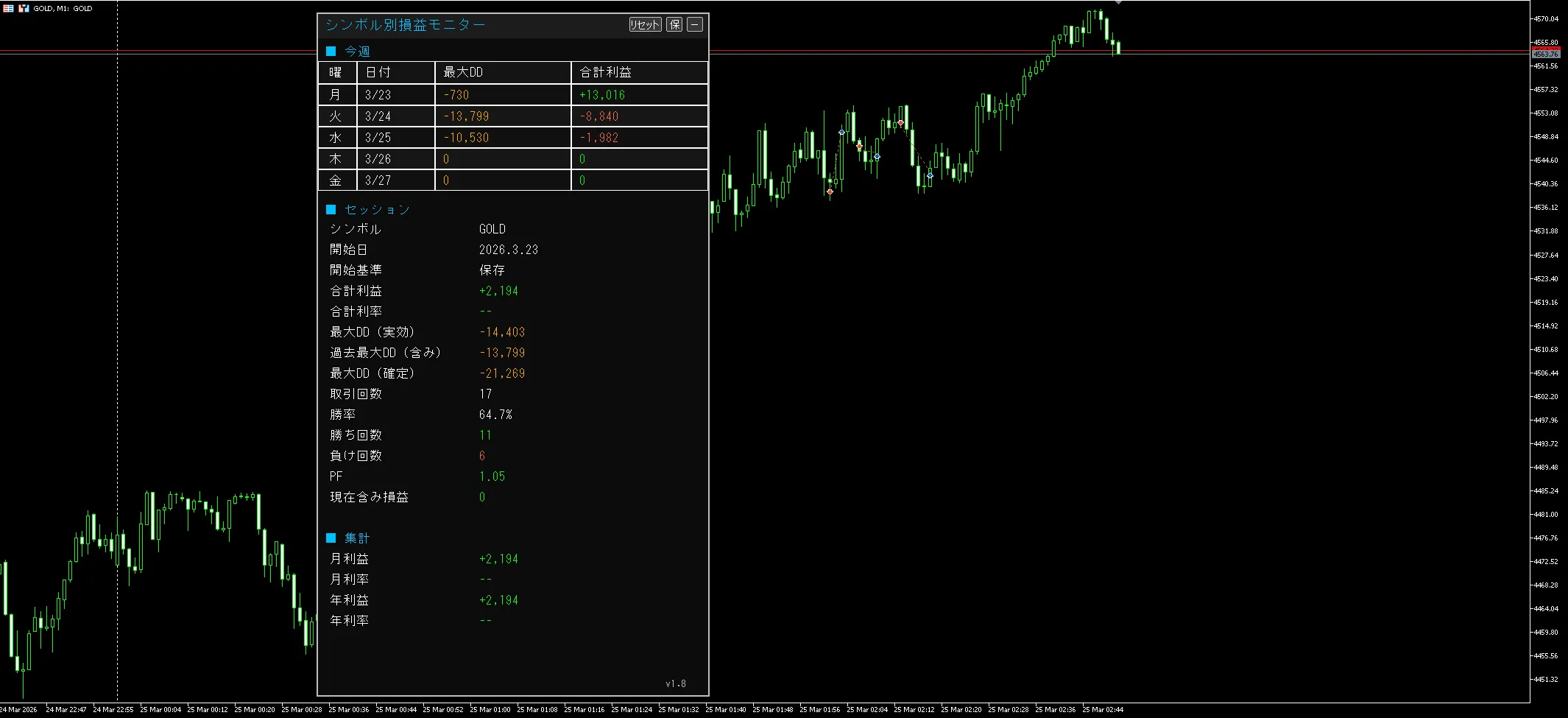 ・損益やDDは過去の取引履歴および現在のポジション状況に基づいて表示されます