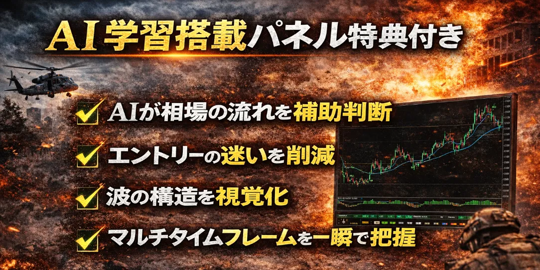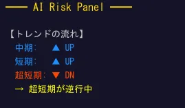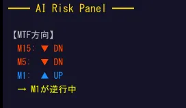 沢山の方からご要望をいただいていたMT5対応ですが、 ようやく形になり無事出品することができました。 今までMT4で使っていた方も、MT5しか使えなかった方も、 どちらにも意味のある内容になっています、 その分しっかり仕上がっています。 それ、あなたの実力不足ではありません その迷いを消すために生まれたのが 画期的なシステムツールAI学習ロジック搭載! 【AI Risk Panel】とは? MT5版天地爆速AIをご購入いただいた方全員に、 このパネルは、 “今の相場がどの状態か”を一目で把握するためのツールです 上昇なのか このツールは エントリーを増やすためのものではありません “負けるトレードを減らすためのツール”です のAI Risk Panelは 「相場の流れを判断してくれる頭脳」 なぜこれが重要なのか?