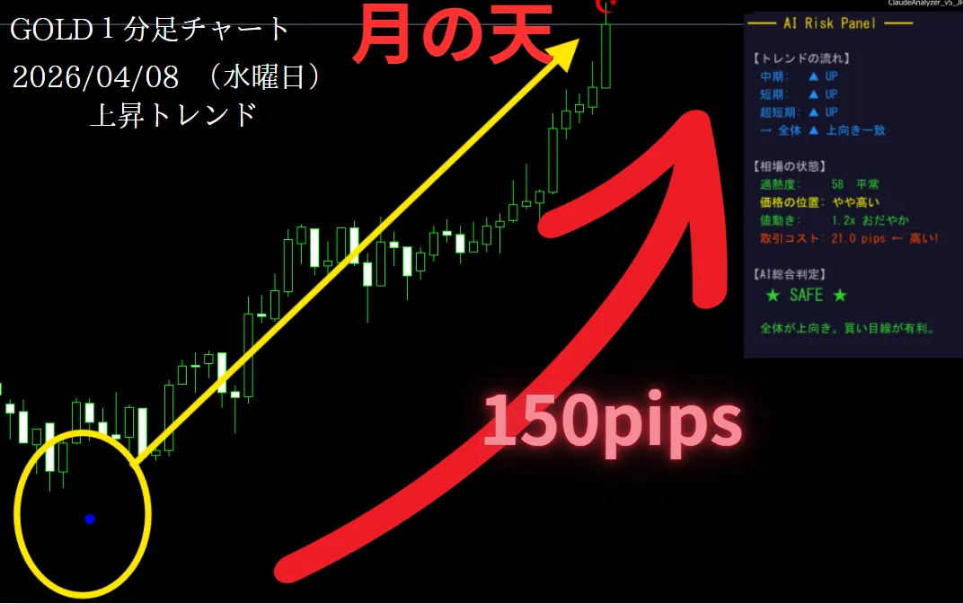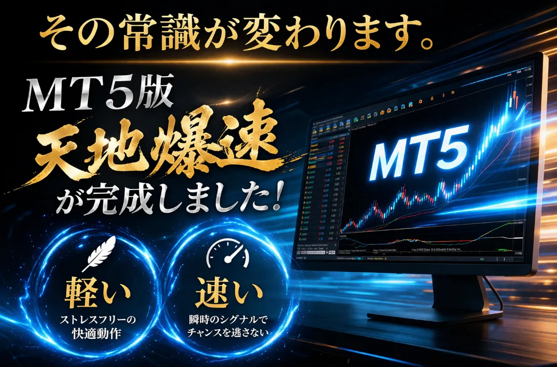 「判断」に迷っている状態」 厳しい言いかたかもしれませんが、 どれだけサインを見ても勝てません そこで開発したのが “相場の流れを可視化するAIパネル”を無償贈呈で付属します 祝2025年も天地爆速!ベストリピート賞受 Gogojungleアワード3年連続受賞!2冠達成!! 2026年04月08日(水曜日)本日の最新結果!! 150pips獲得!! 実際のチャートこちら↓↓↓ 天地爆速が点灯した瞬間 一日で一撃 +300pips +300,000円の利益! 確かに天地爆速は、高い勝率を誇りますが、本当に見るべきは、その勝率を支えている理論的な根拠ある構造です。 単なるサイン表示ではなく「上位足の環境認識」を組み込んだ構造にあります。 これにより、「小さな波に振り回されて負ける」という従来の弱点を徹底的に排除しました。 根拠がまる見えの状況となり利益がでないほうが難しい環境を手に入れられます! 1時27分、「月の天」のサインが出現 売り優勢に切り替わるシグナルを確認 そこから一気に下降トレンドが加速 最終的に「月の地」で63pipsの利幅+63,000円の利益 月×太陽×スーパームーン3つの根拠ある一撃のみで!! gold1分足 2025/8/08(金曜日)20時26分~上昇トレンド +153pips +153,000円の利益! gold1分足 2025/2/03(月曜日)12時37分~上昇トレンド +160pips +160,000円の利益! gold1分足 2025/1/16(木曜日)21時45分~上昇トレンド +80pips +80,000円の利益! gold1分足 2025/1/14(火曜日)23時12分~上昇トレンド +91pips +9万1000円の利益! gold1分足 2025/1/08(水曜日)19時38分~下降トレンド +45pips +4万5000円の利益! 【実際に使い続けた人だけが知っている“結果の違い”】 【利益に変わったリアル体験談】 新次元のFX革命 MT5対応・1分足特化 そして それが この新作には、 少しだけ、その背景をお話させてください。 私はこれまで、膨大なマーケットデータをもとに その中で辿り着いたのが 「相場の波動構造を可視化する」という考え方です 認定テクニカルアナリストとして、 感覚に頼らない これを徹底的に追求してきました。 そして長年、相場と向き合う中で、 相場には 「波動の循環」と が存在するということです 価格はランダムに動いているように見えます しかし実際は、 複数の時間軸のトレンドが重なり合い、 そして私は気づきました この複雑な構造を、 そこで 私はAIを組み合わせました 認定テクニカルアナリストとして培ってきた、 未来の値動きを推論する思考。 この“人間の洞察力”をAIに落とし込み、 さらにAIの持つ 膨大なパターン認識 これらを掛け合わせました。 その結果 これまで曖昧だった相場の裏側が、 これが、 人の分析力 × AIの処理能力 この融合によって生まれた、 独自開発ロジックです。 そして完成したのが、 「天地爆速 MT5版 AI」 このツールは、 ・相場の波形 これらに加え、 AIが“相場の流れ”を補助判断し、 つまり、 ・感覚ではなく“根拠”で判断する ための環境を作り出します ここが最も重要です。 これは、ただのサインツールではありません 一般的なインジケーターは、 「サインが出たから入る」 という使い方になります。 しかし それが負ける原因です 「天地爆速 AI」は違います ・なぜここで入るのか これらを明確にし、 “入るかどうか”まで判断させるツールです。 つまり、 トレーダーの 相場は、感覚では勝てません。 必要なのは、 構造を理解し、波を読む力。 そして、 その判断を支える“精度”です。 私は、初心者の方を本気で救いたいと思っています。 この想いは、10年前から一切変わっていません。 このページにたどり着いたあなたは、 不安がある そう感じているかもしれません ですが、安心してください 私も最初は同じでした 相場が怖いのは当然です なぜなら、 「分からない」からです 人は、分からないものに恐怖を感じます。 しかし 相場の動きを理解し、 その“怖さ”は確実に消えていきます 曖昧だったものが見えるようになり、 そしてAIは、 その“理解までの距離”を一気に縮めます だからこそ 私は 「MT5版 天地爆速AI」を作りました。 このツールは、 相場の流れを理解し、 迷いを減らし、 恐怖だった相場を、 “理解できる世界”へ変える そして これまで見えなかった相場の本質が、見えるようになる それが、 「天地爆速 MT5版 AI」です そして